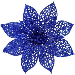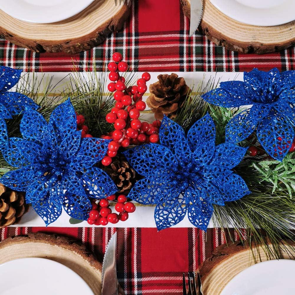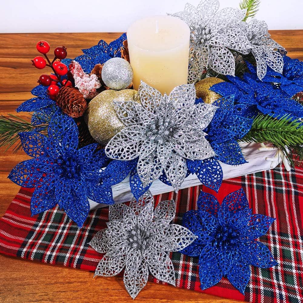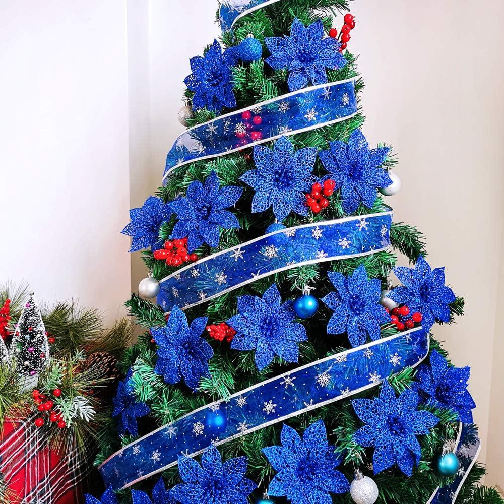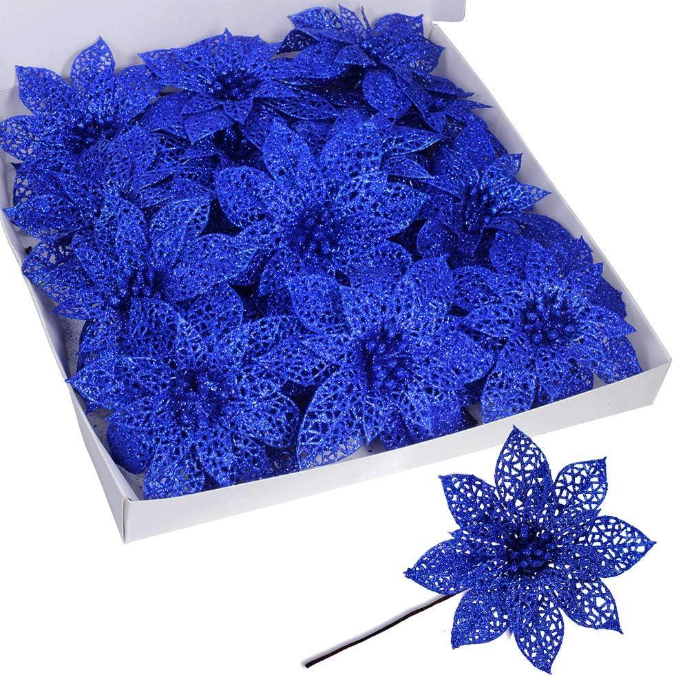 Supla 24 Pack Christmas Red Glitter Poinsettia Flowers Picks Christmas Tree Ornaments 5.9″ Wide for Red Christmas Tree Wreaths Garland Holiday Seasonal Wedding Decorations White Gift Box Included(Blue)