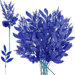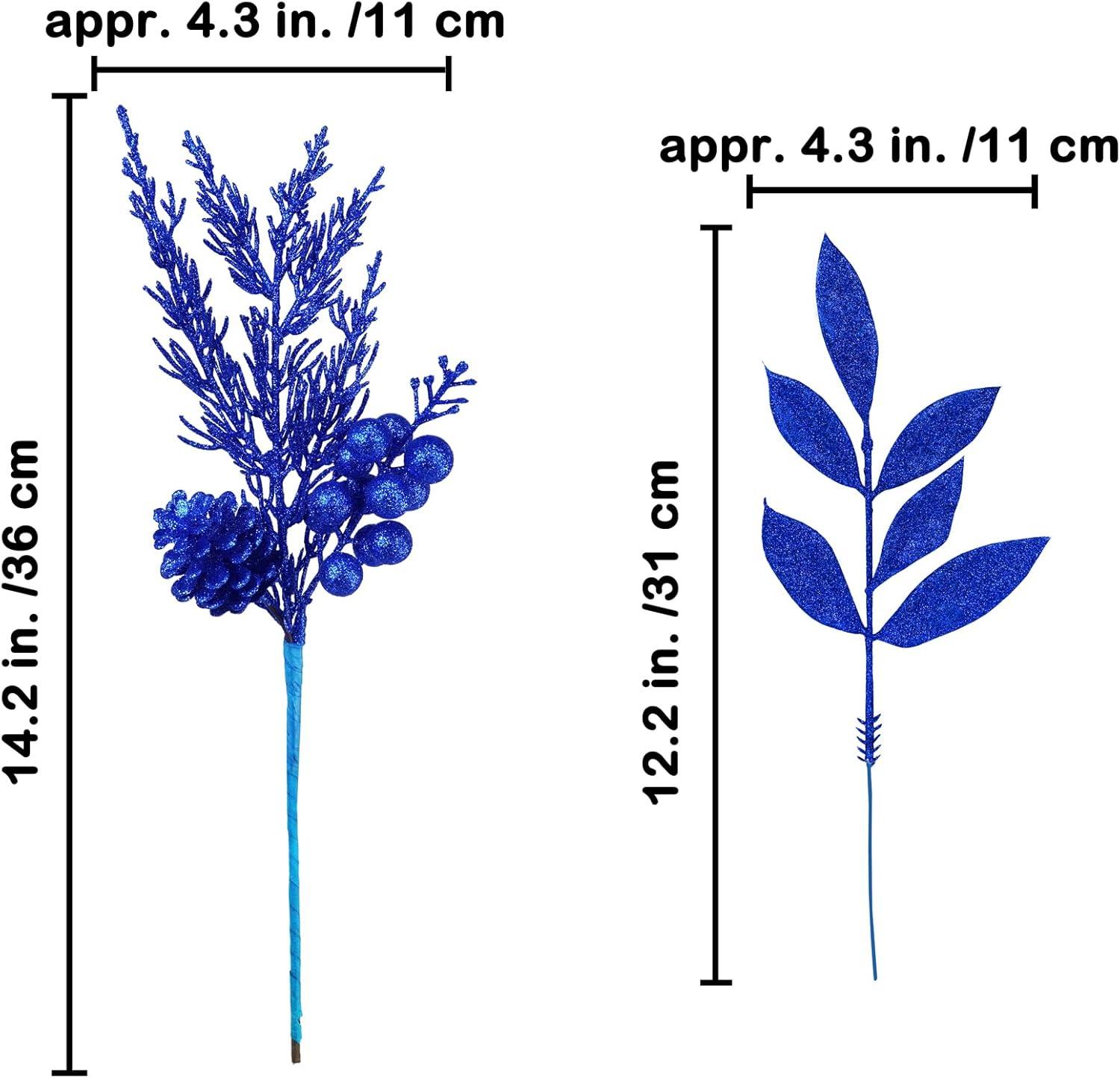 Winlyn 24 Pcs Christmas Artificial Leaf Sprays Pine Needles Pinecone Berries Stems Silver Glittered Christmas Decoration Picks 12.2″- 14.2″ Tall for Silver Christmas Tree Vase Fillers Wreath Décor(Blue)