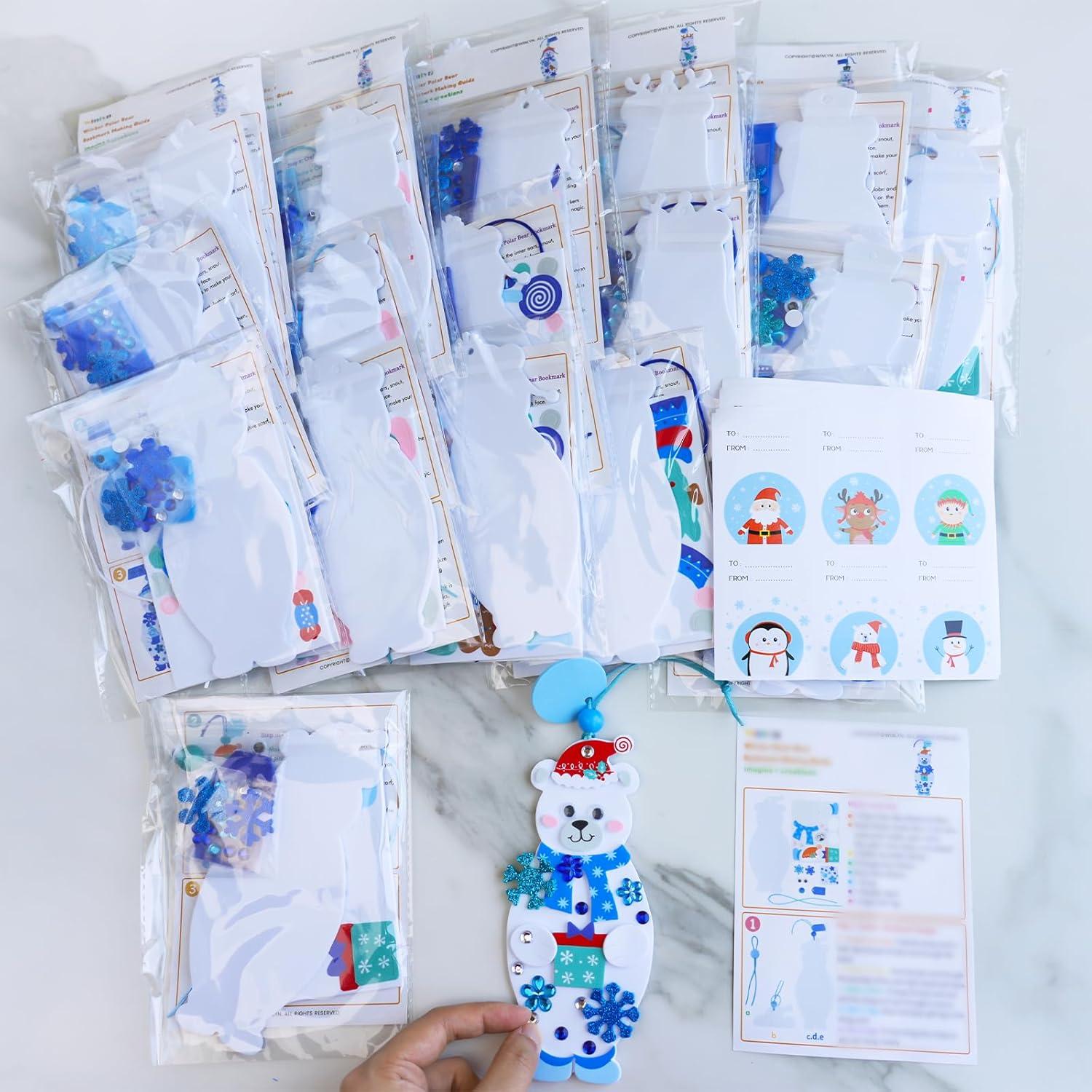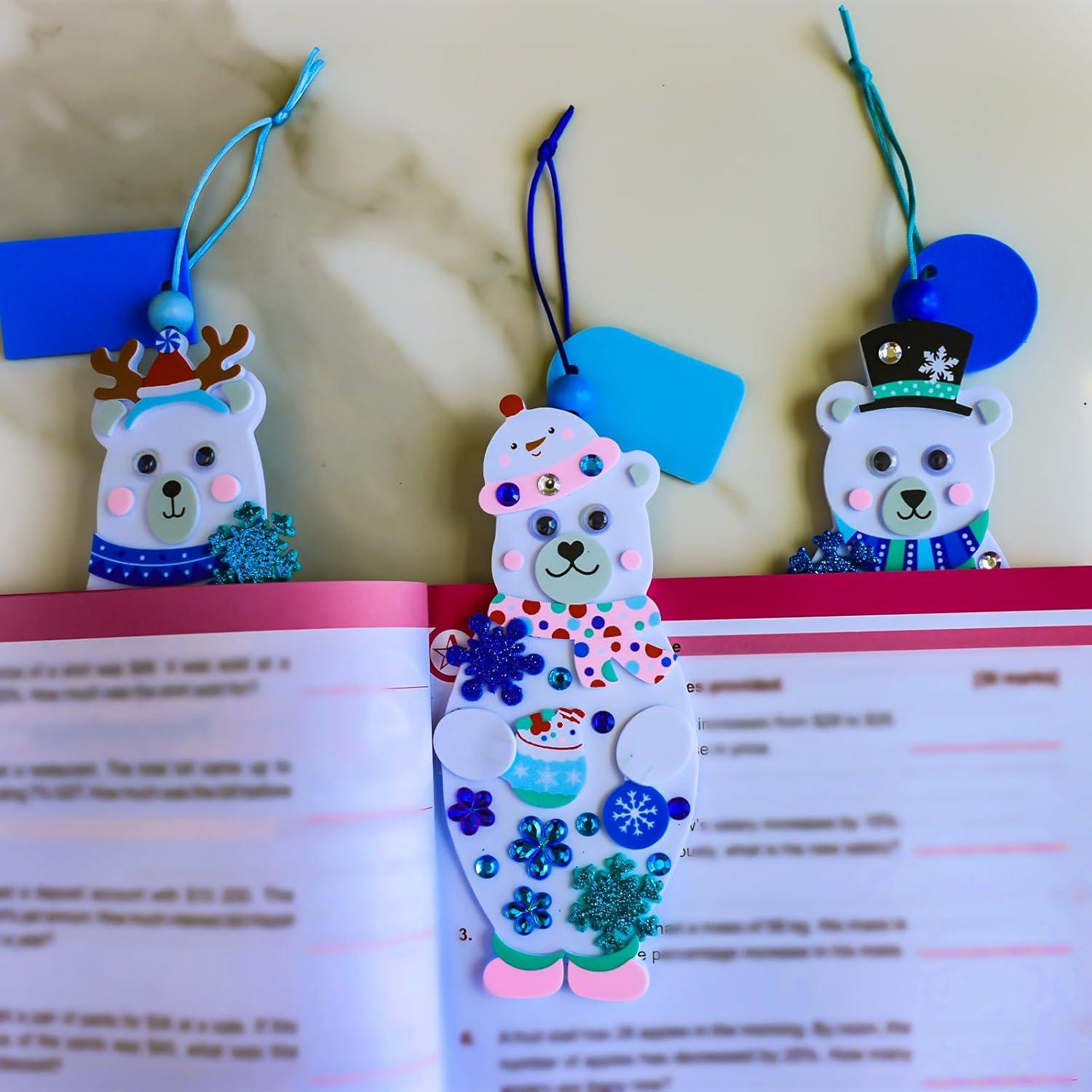 Winlyn 24 Sets Winter Decorations DIY Polar Bear Ornament Bookmark Christmas Craft Kits Foam Polar Bear Bookmark with Festive Snowflake Foam Stickers for Kids Holiday Classroom Activities Party Favors