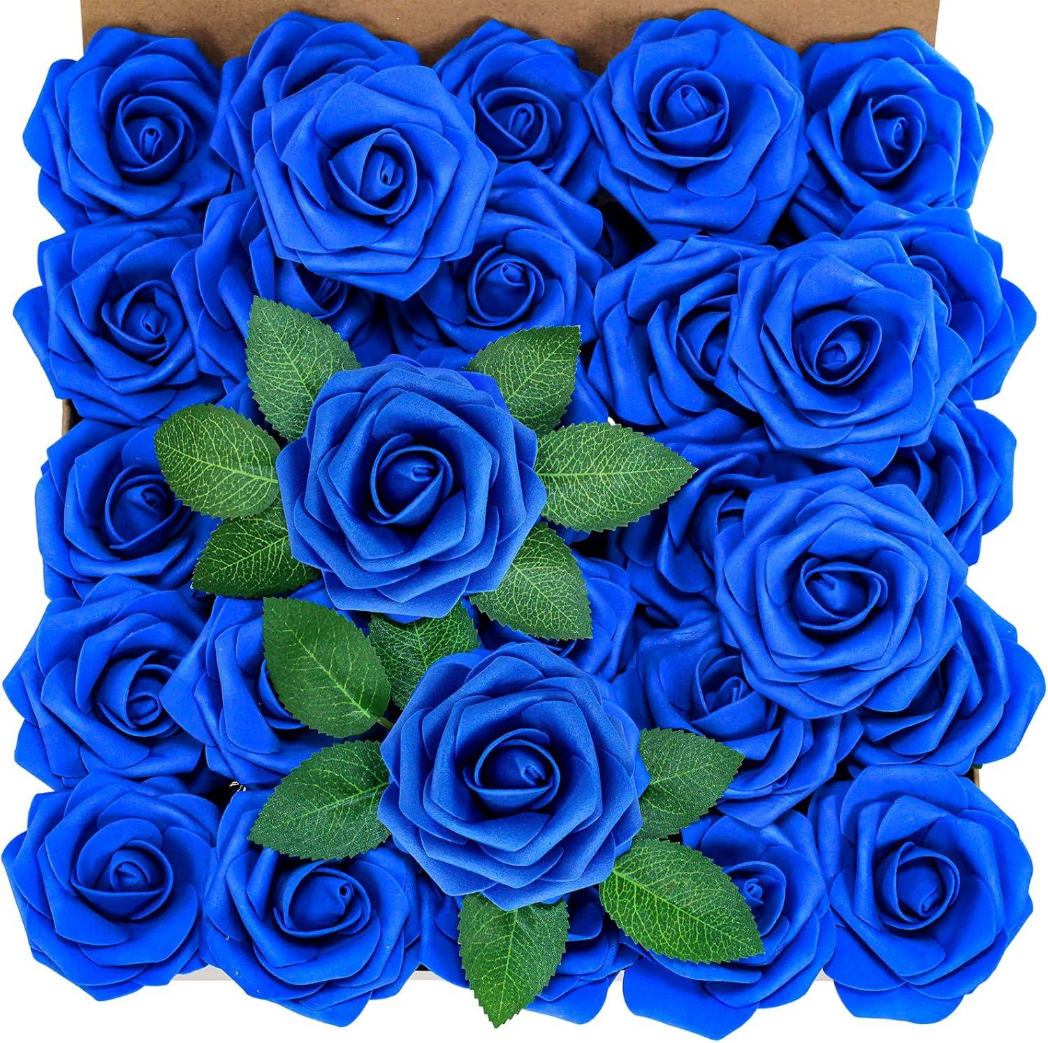 Winlyn 50 Pcs Real Looking Artificial Rose Flowers with Stems & Silk Leaves Bulk- Red, Pink, White for Wedding Bouquets Centerpieces Baby & Bridal Showers Valentine’s Day Mother’s Day DIY Floral Decor(Royal Blue)