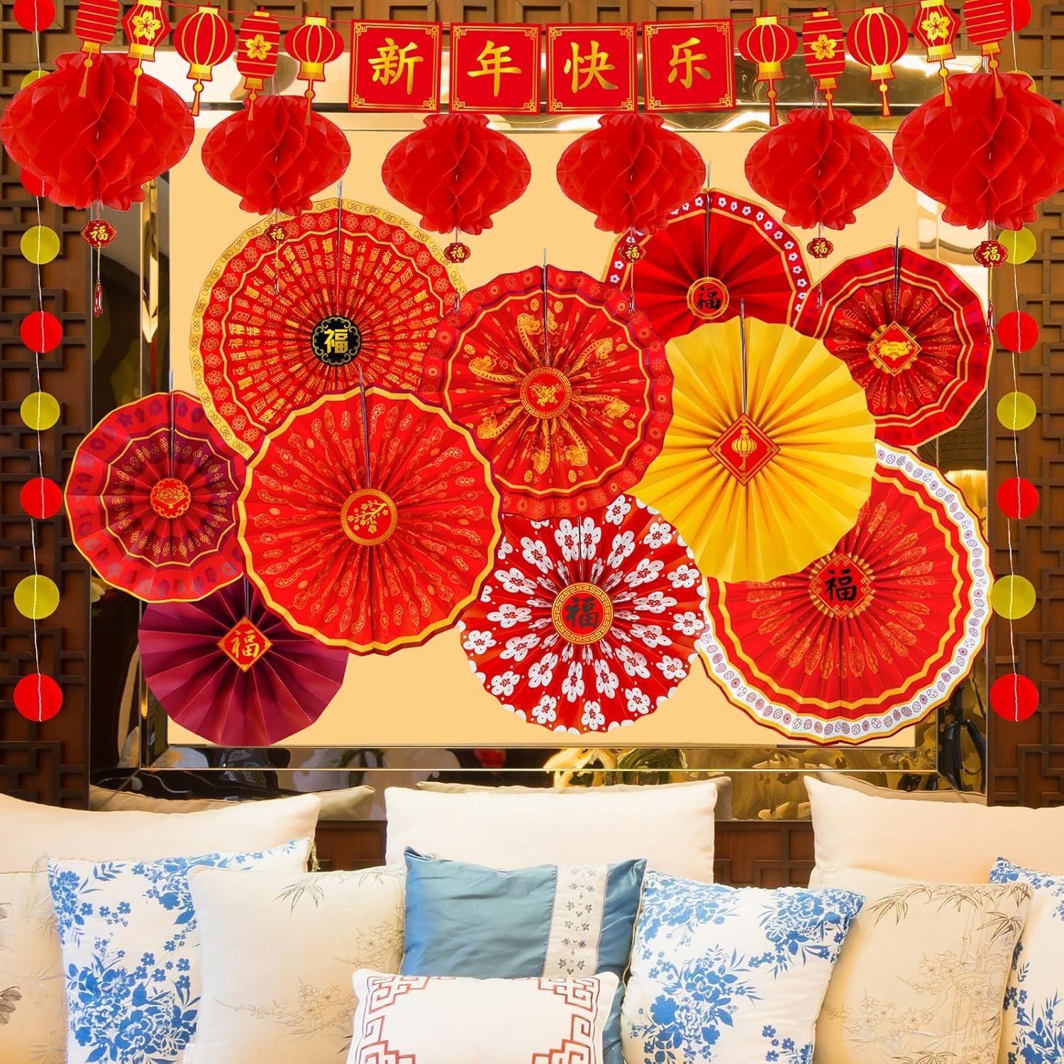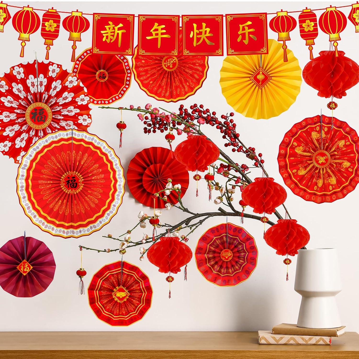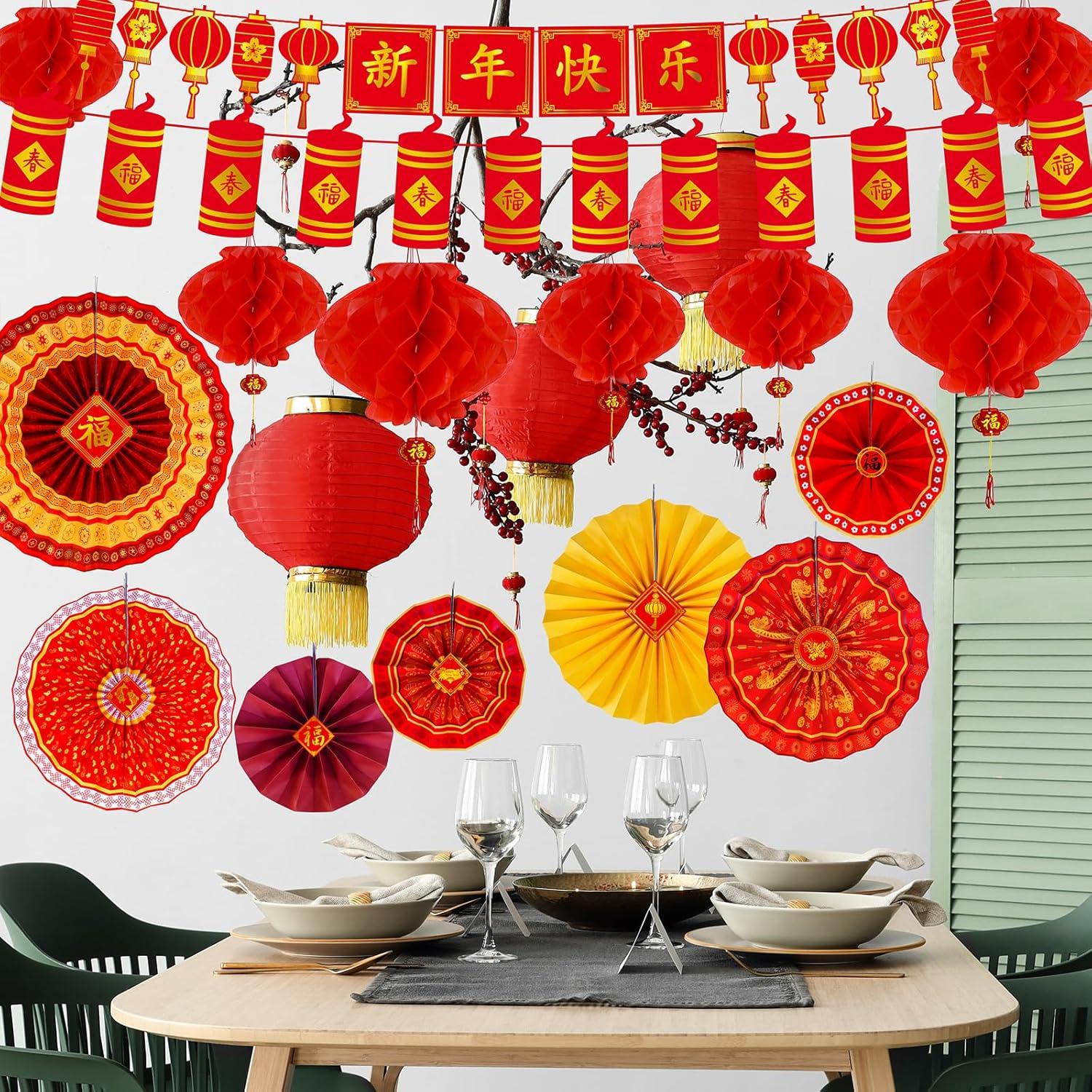 Winlyn Bulk Chinese New Year Party Decorations Oriental Hanging Red Lanterns Lucky Garland Party Swirls New Year Banner Honeycomb Balls for Asian Lunar New Year Snake Year Festival Wedding 2025 Decor
