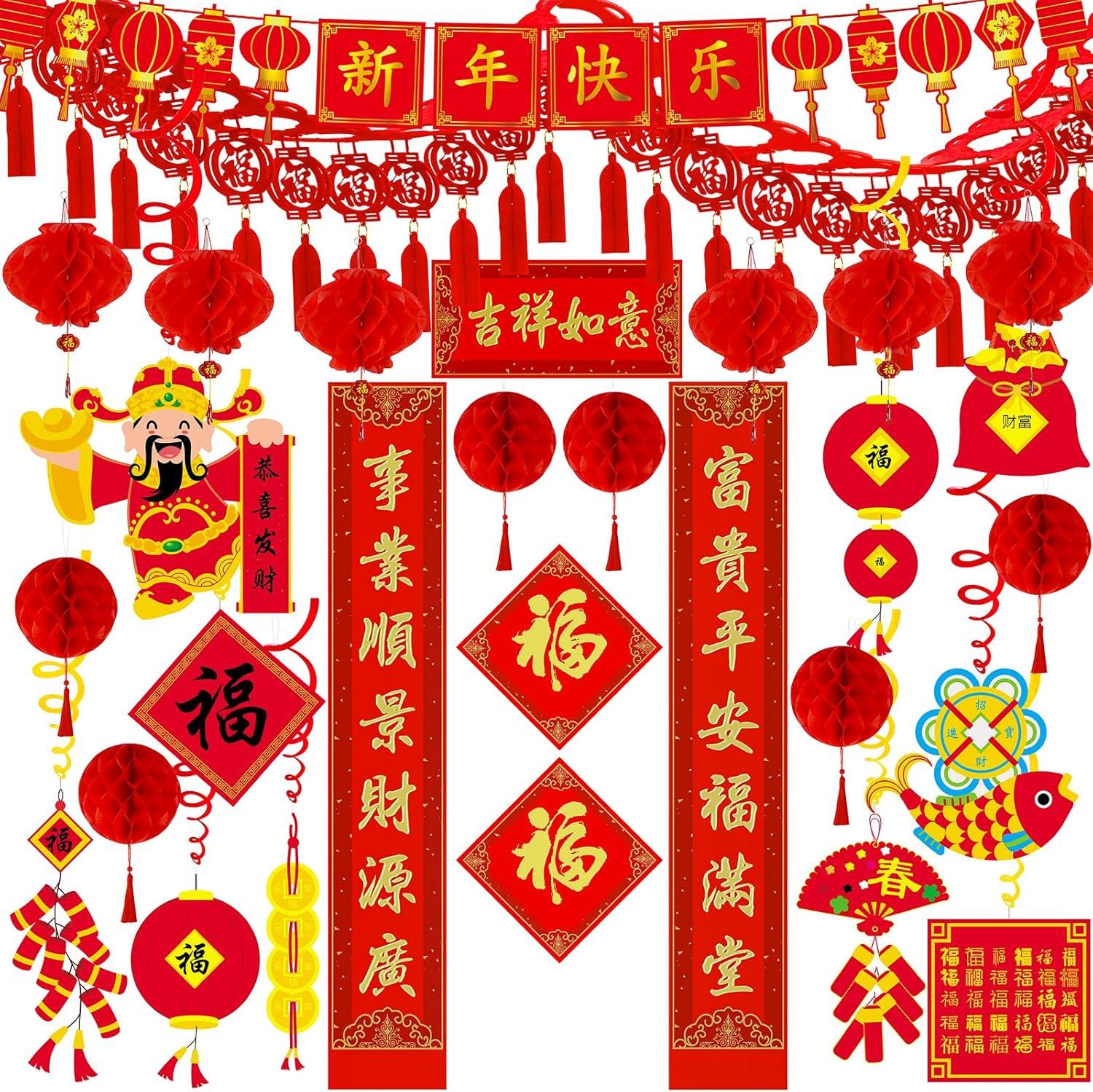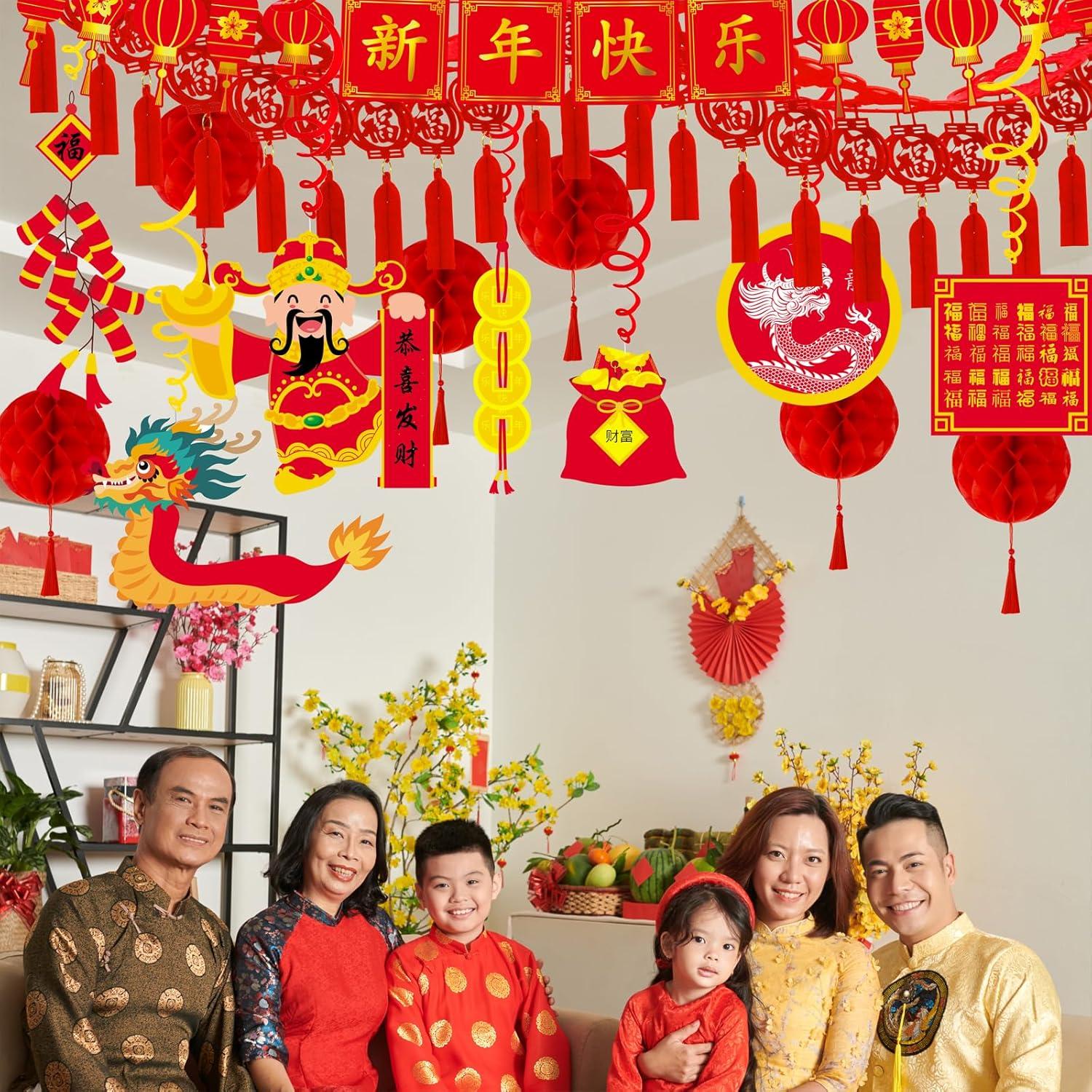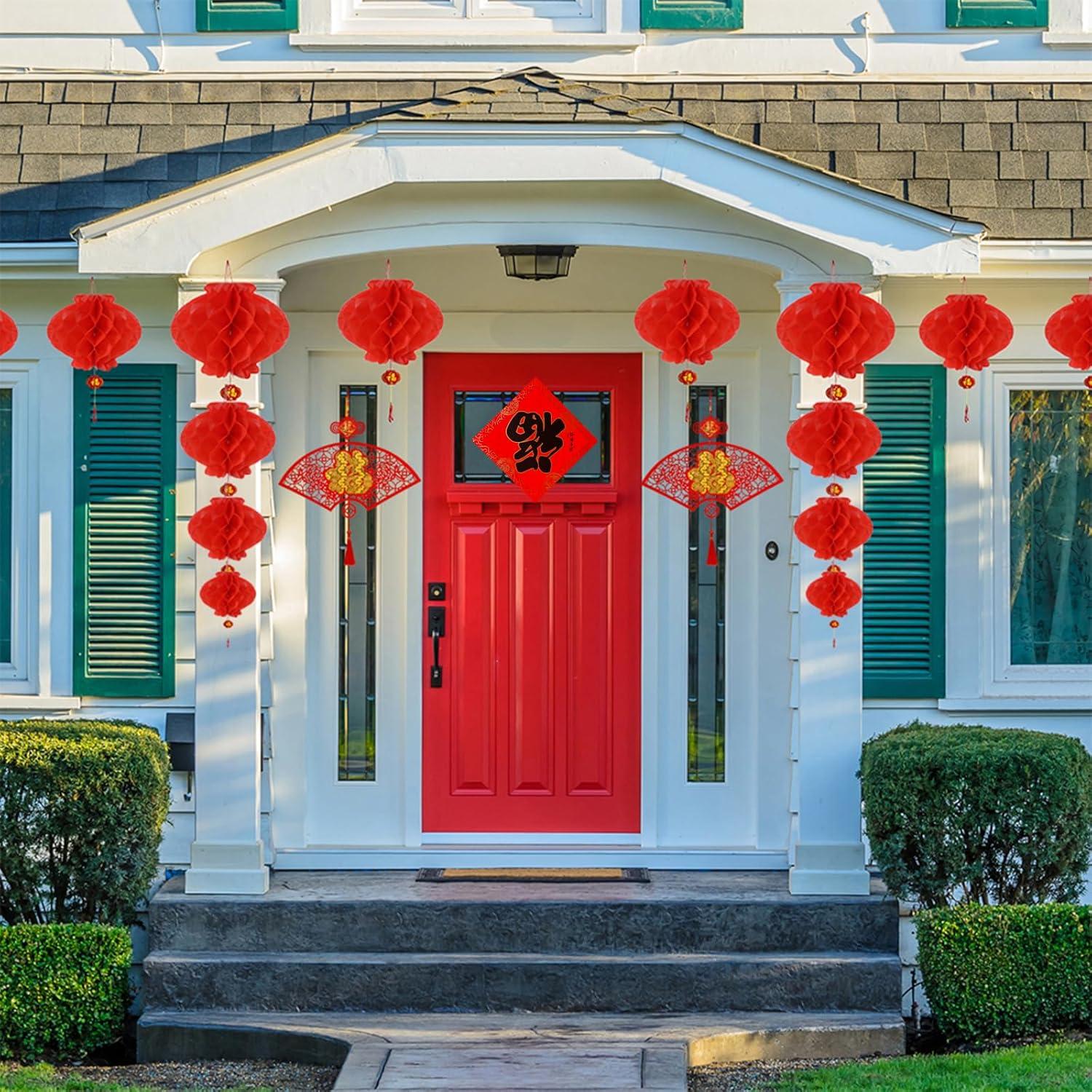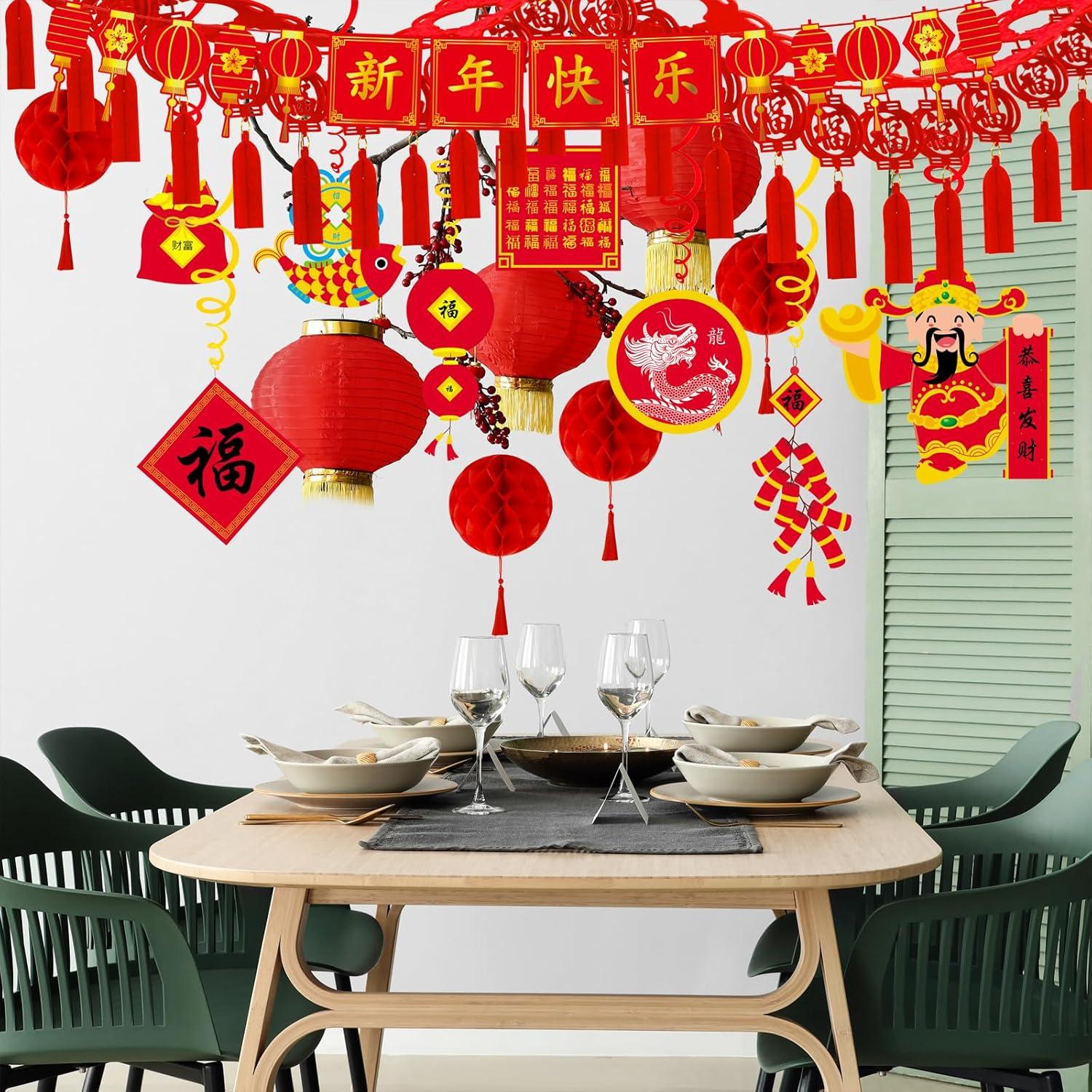 Winlyn Bulk Chinese New Year Party Decorations Oriental Hanging Red Lanterns Lucky Garland Party Swirls New Year Banner Honeycomb Balls for Asian Lunar New Year Snake Year Festival Wedding 2025 Decor
