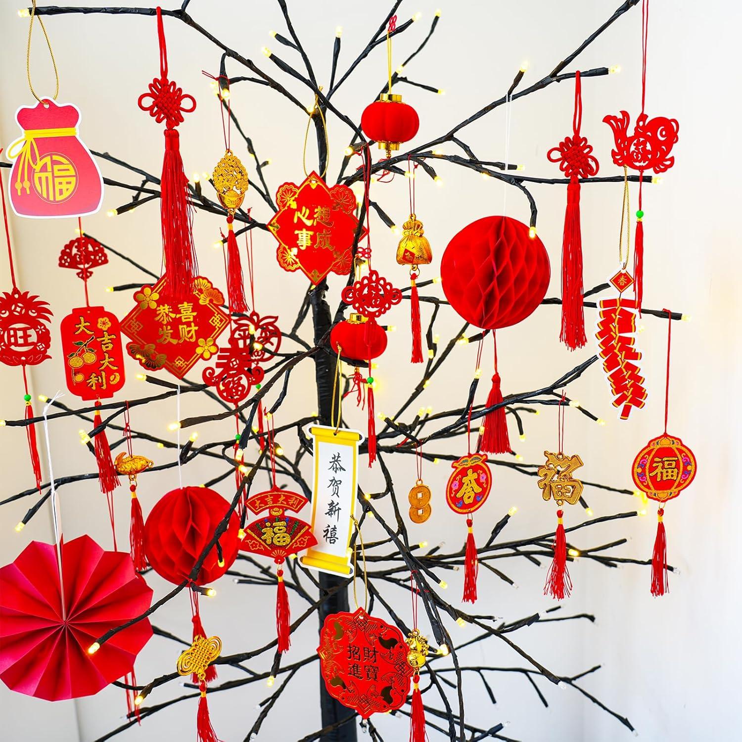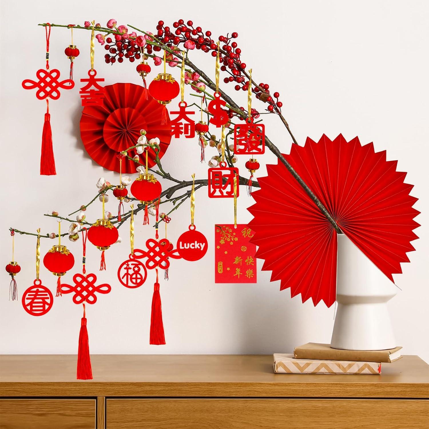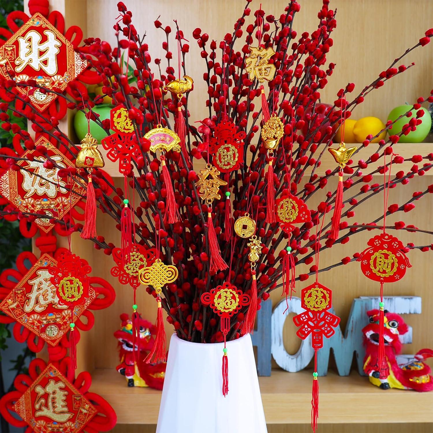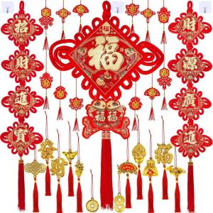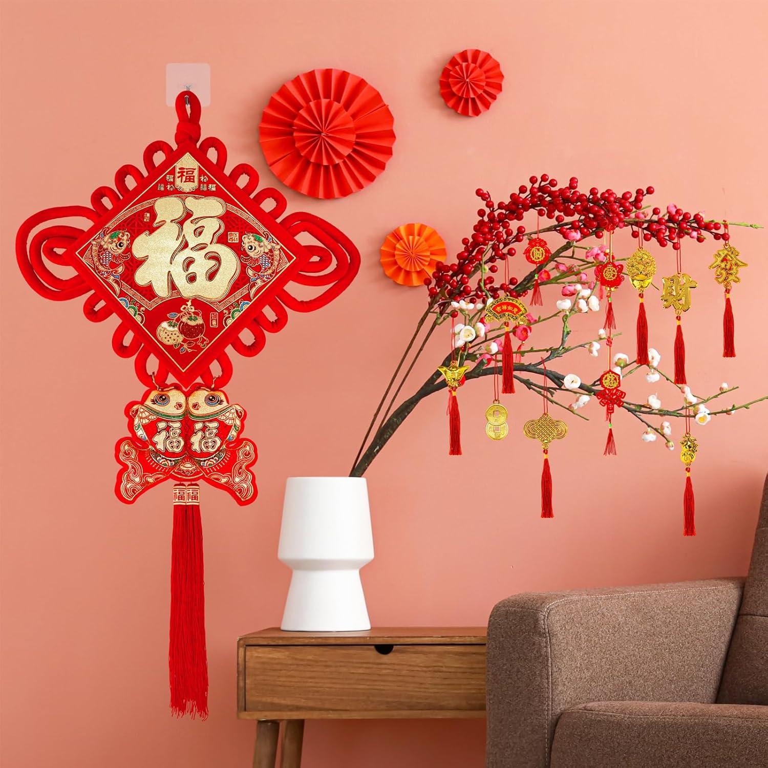 Winlyn 27 Pcs Chinese New Year Decorations Fu Red Knot Tassel Hanging Oriental Lucky Ornaments Spring Wall Ornaments Red Good Luck Tree Ornaments for Asian Lunar New Year 2025 Snake Year Party Decor
