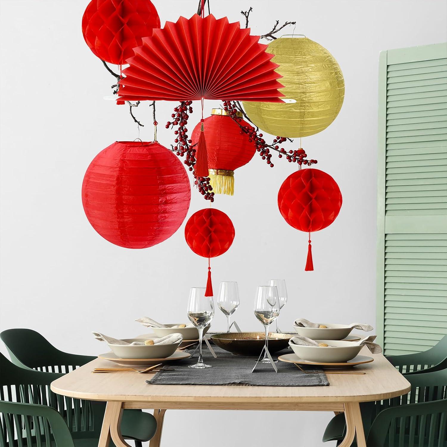 Winlyn 22 Pcs Chinese New Year Decorative Red Gold White Round Paper Lanterns Honeycomb Balls Paper Fans Oriental Hanging Party Decorations for Asian Chinese Japanese Lunar New Year Festival Wedding