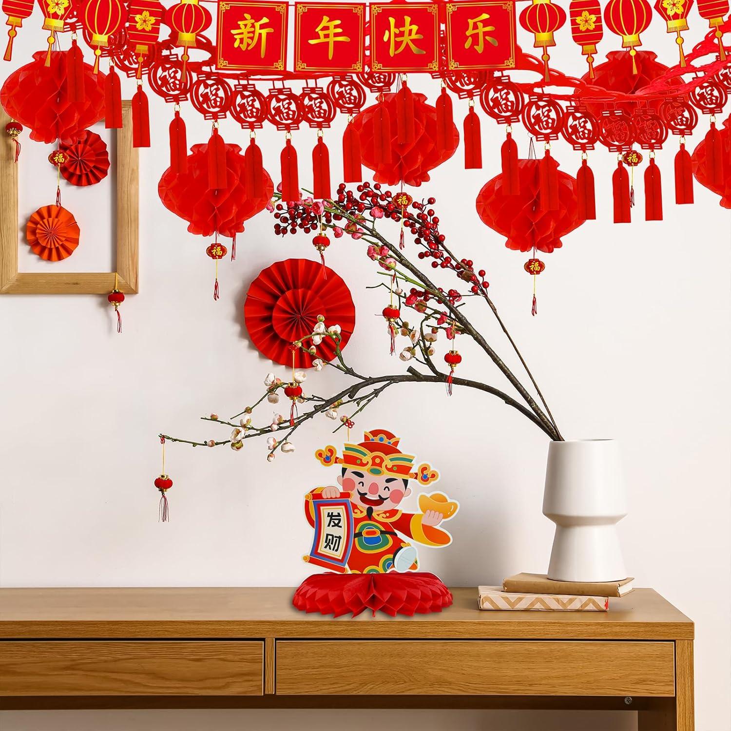 Winlyn 18 Pcs Chinese Lunar New Year Party Decorations Good Luck Honeycomb Centerpieces Hanging Red Lanterns Lucky Garland New Year Banner for Asian Vietnamese Tet Festival Wedding Horse Year 2026