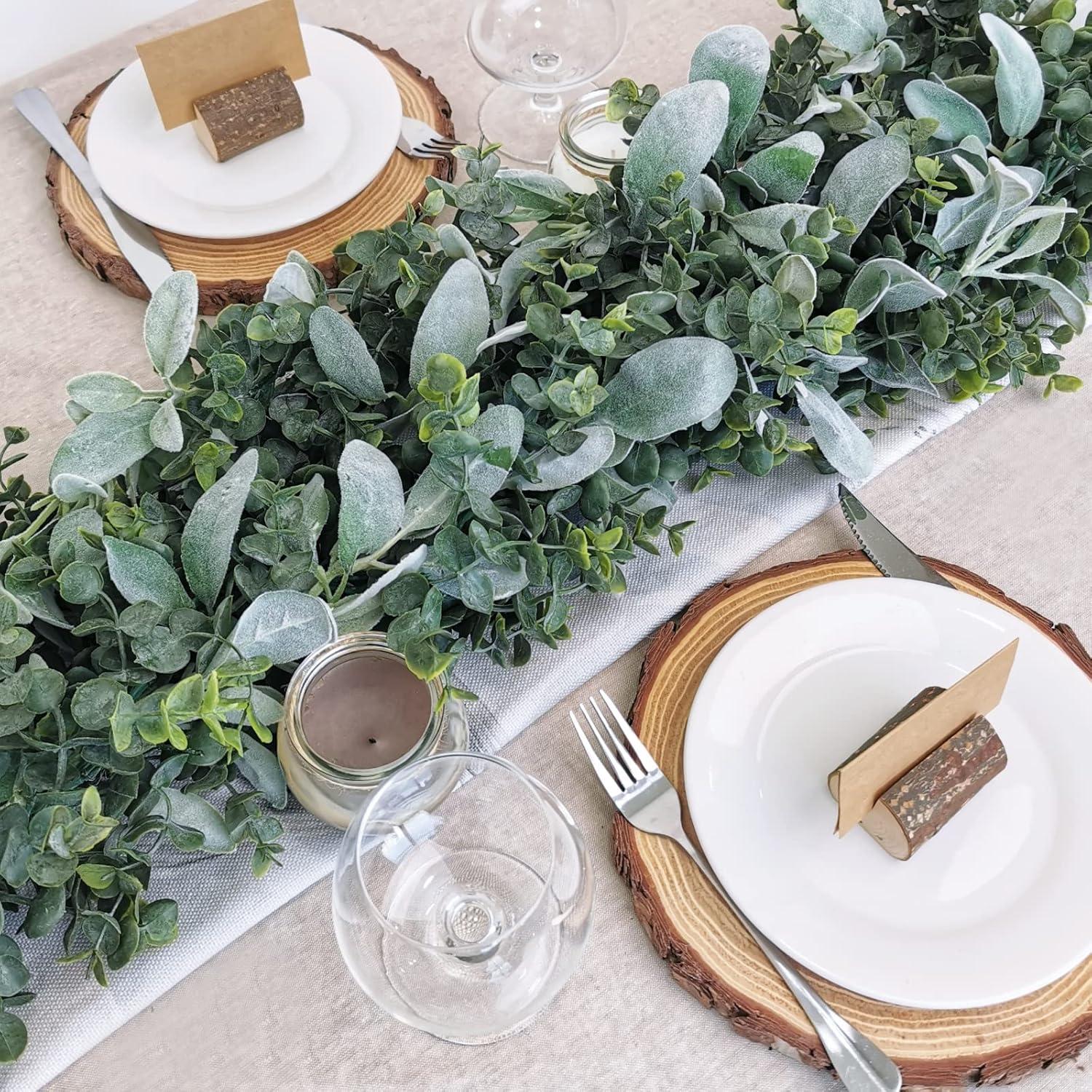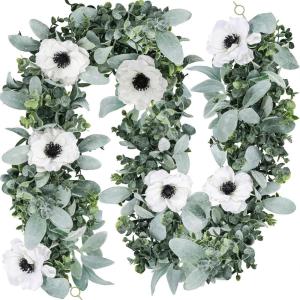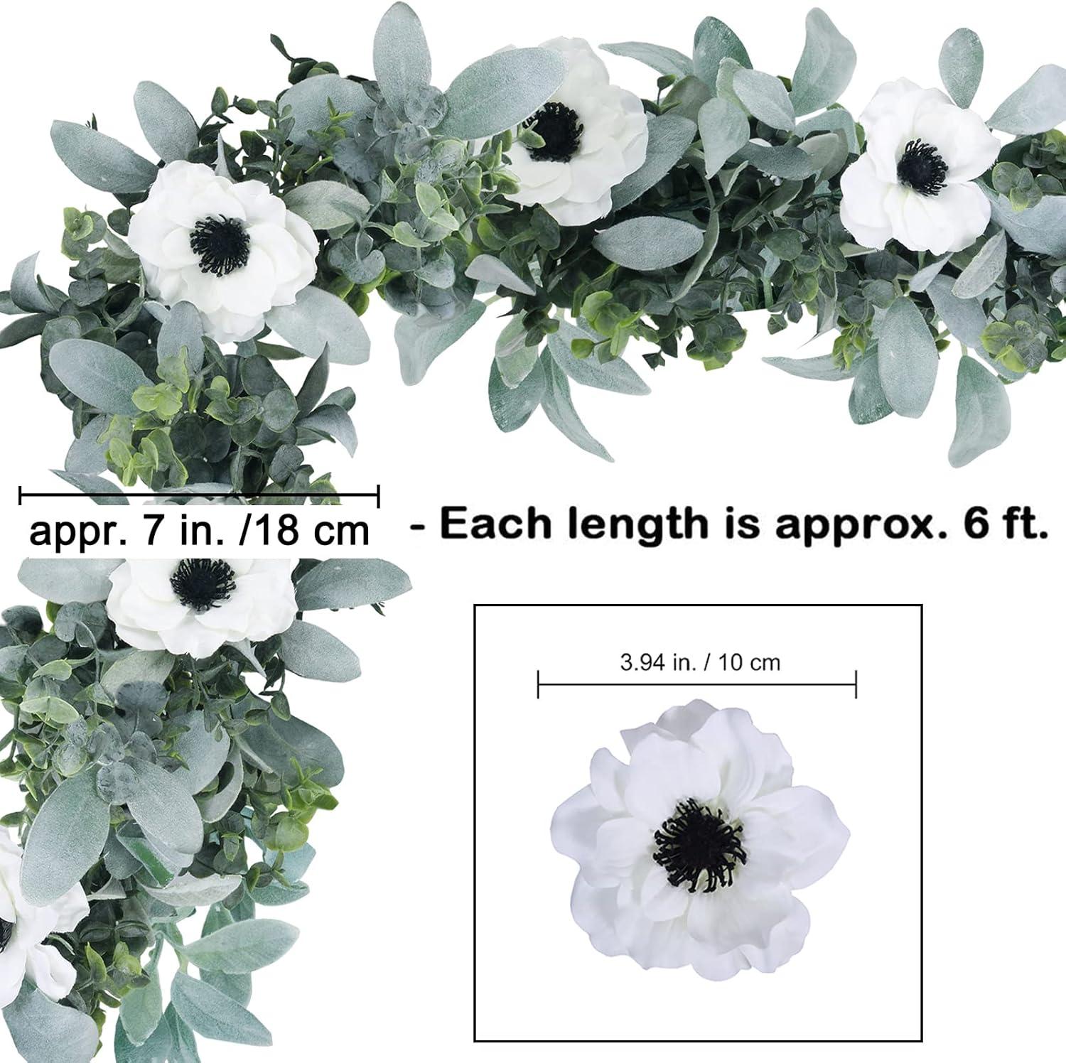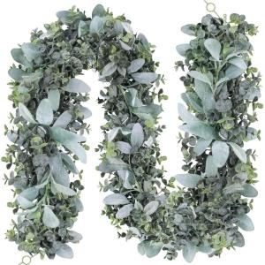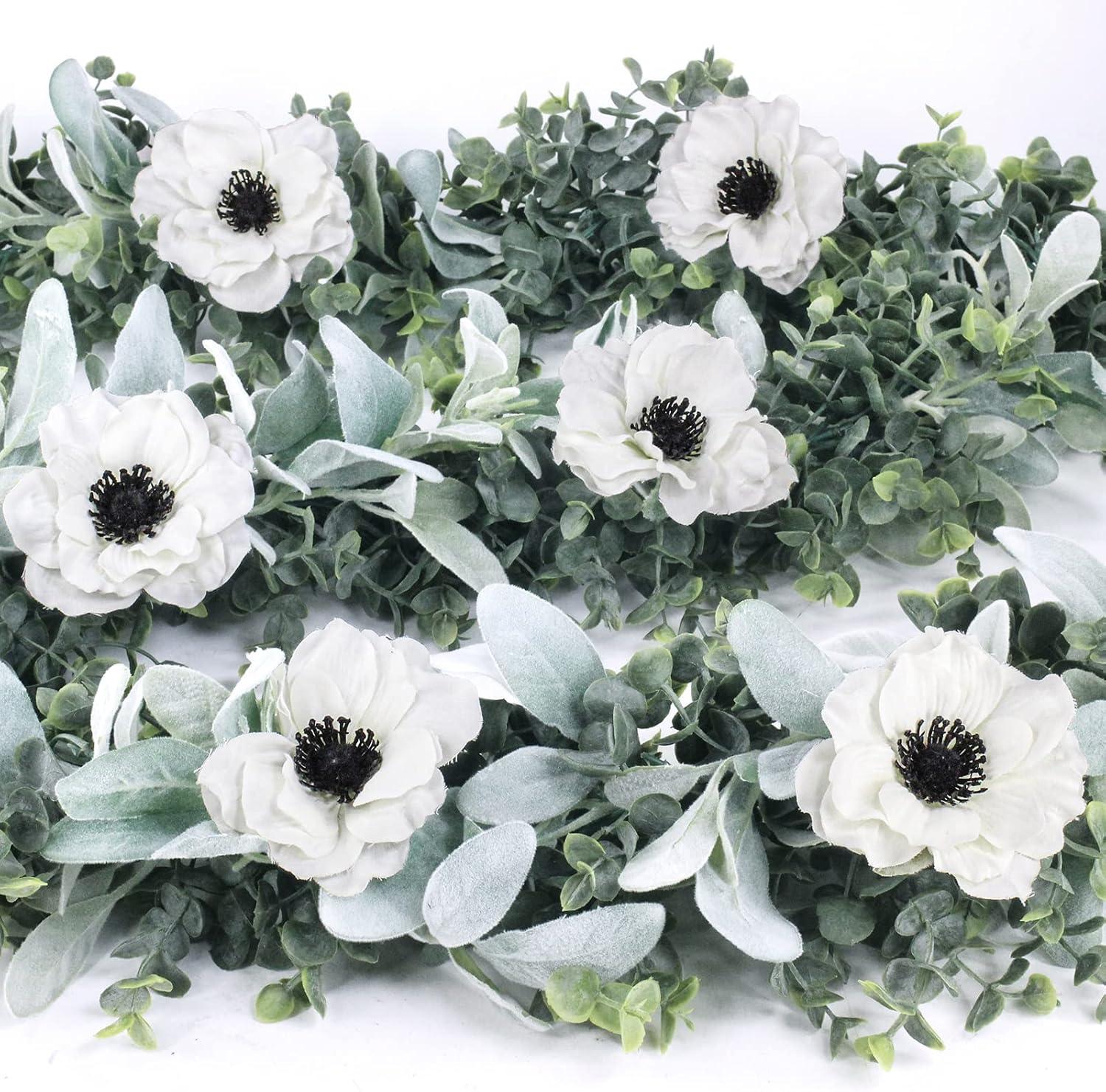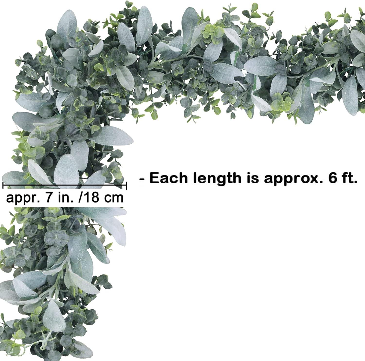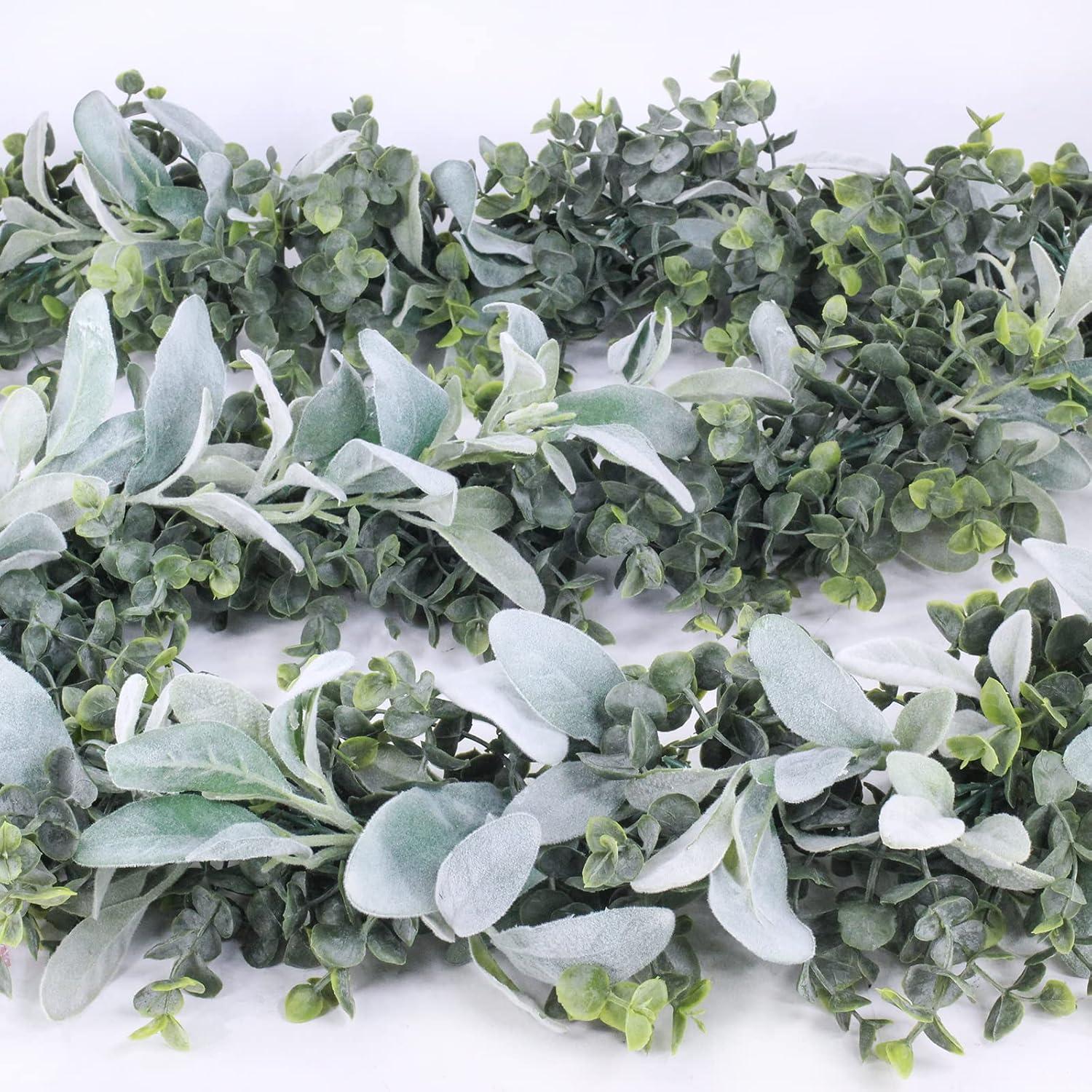 6′ L Faux Mixed Eucalyptus Leaves and Lamb’s Ear Leaves Garland with Artificial White Flower for Farmhouse Wedding Arch Backdrop Table Runner Centerpiece Mantel Indoor Outdoor Greenery Decor
