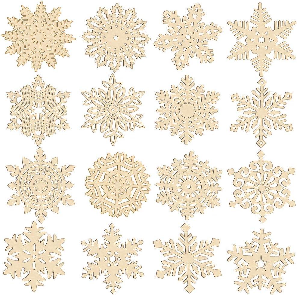 32 Set Christmas Hanging Natural Unfinished Wood Snowflake Cutouts Ornaments Ready-to-Personalize Wooden Snowflake Rustic Winter Paintable Ornaments for Kids Holiday Xmas Party Crafts