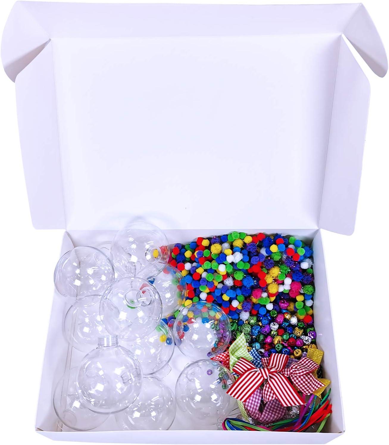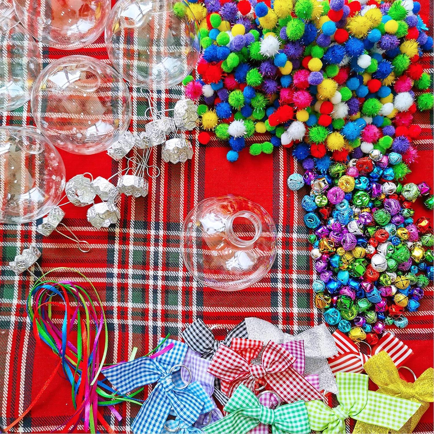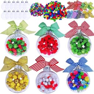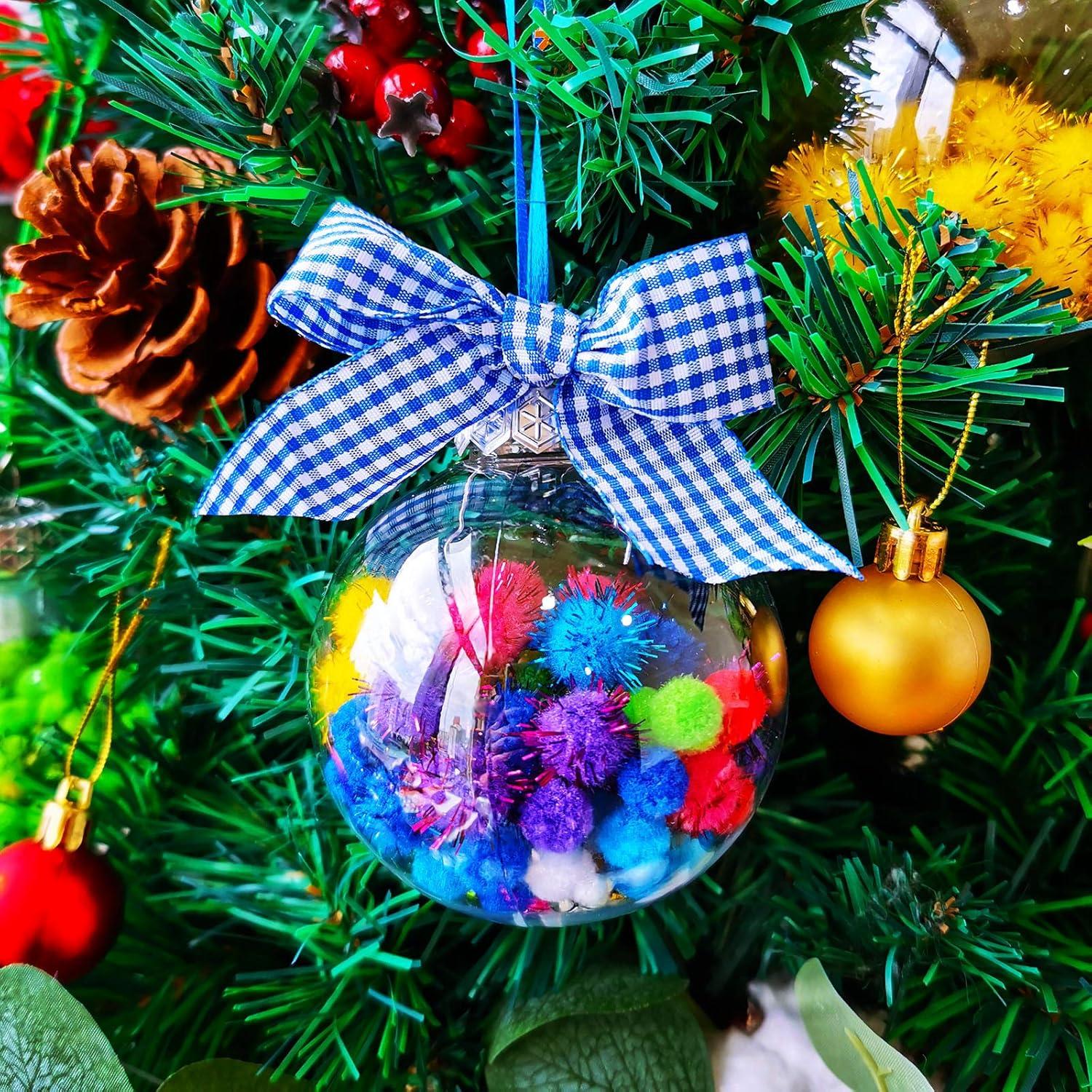 Winlyn 12 Sets Christmas Bulb Ornament Balls Clear Plastic Glass Ball Craft Kit Bauble Ornaments Fillable Unbreakable Shatterproof Hanging Tree Ornaments Jingle Bells Pom-poms Bows for Holiday Décor