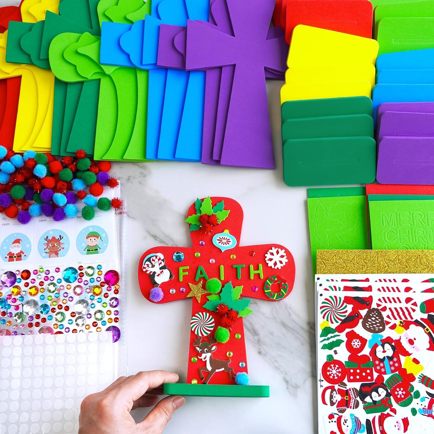 Winlyn 24 Sets Christmas Craft Kits DIY Christmas Cross Ornaments Decorations Art Sets Snowman Snowflake Christmas Foam Stickers Arts and Crafts for Kids Party Classroom Sunday School VBS Activities