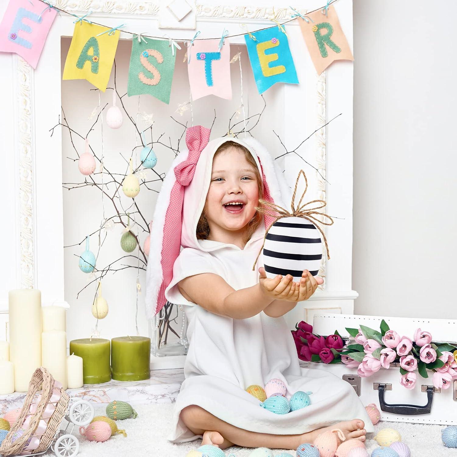 Color: The set of 3 Easter egg ornaments features white egg with black stripes, white egg with black polka dots, and black egg with white polka dots. At the top there is a coordinating natural jute twine bow that gives a farmhouse touch. With neutral black & white patterns, these hanging Easter eggs create an Easter mood in a modern ambiance. They are perfect to add a touch of whimsical and country approach to your Easter decorating.