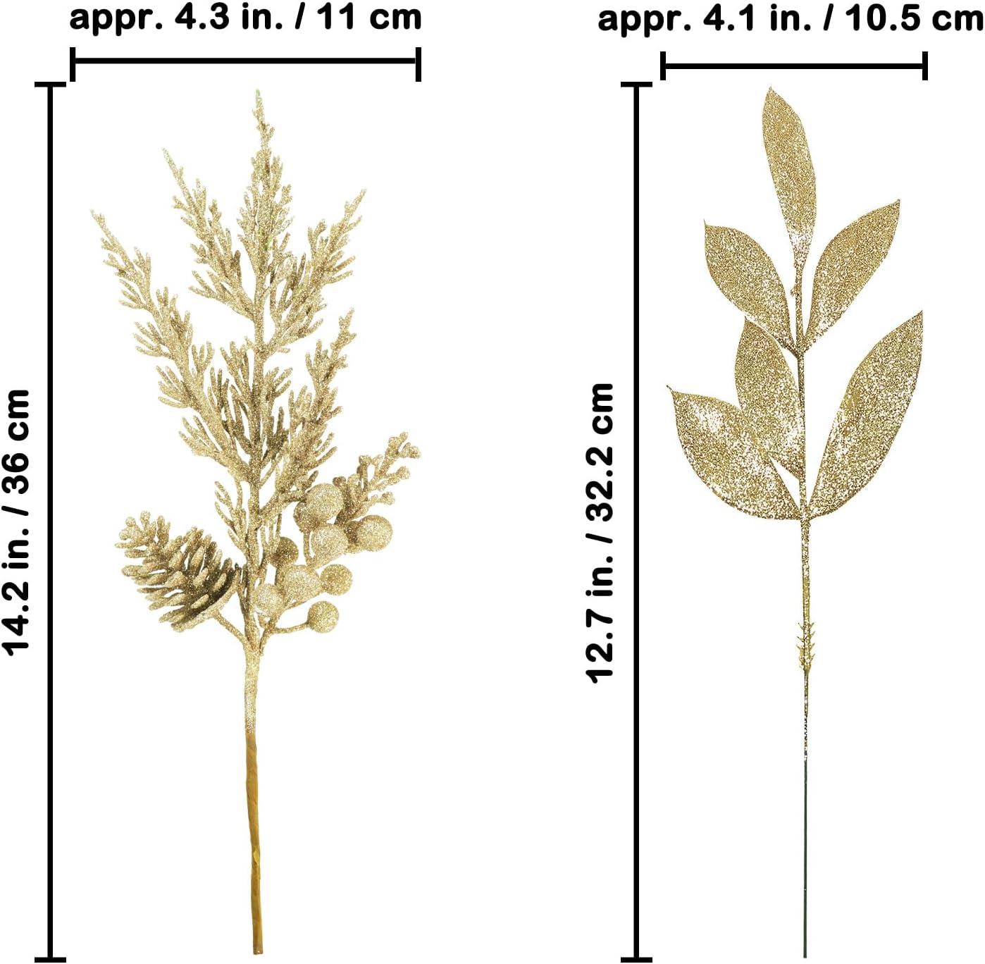 Size: Each glitter leaves spray measures approximately 12.2″ in length and 4.3″ in width. Each glitter pine pick is 14.2″ long and 4.3″ wide. These glitter picks are perfect for seasonal floral arrangements, wreaths, swags, garlands, gift wrapping, and DIY crafts, providing endless creative options.