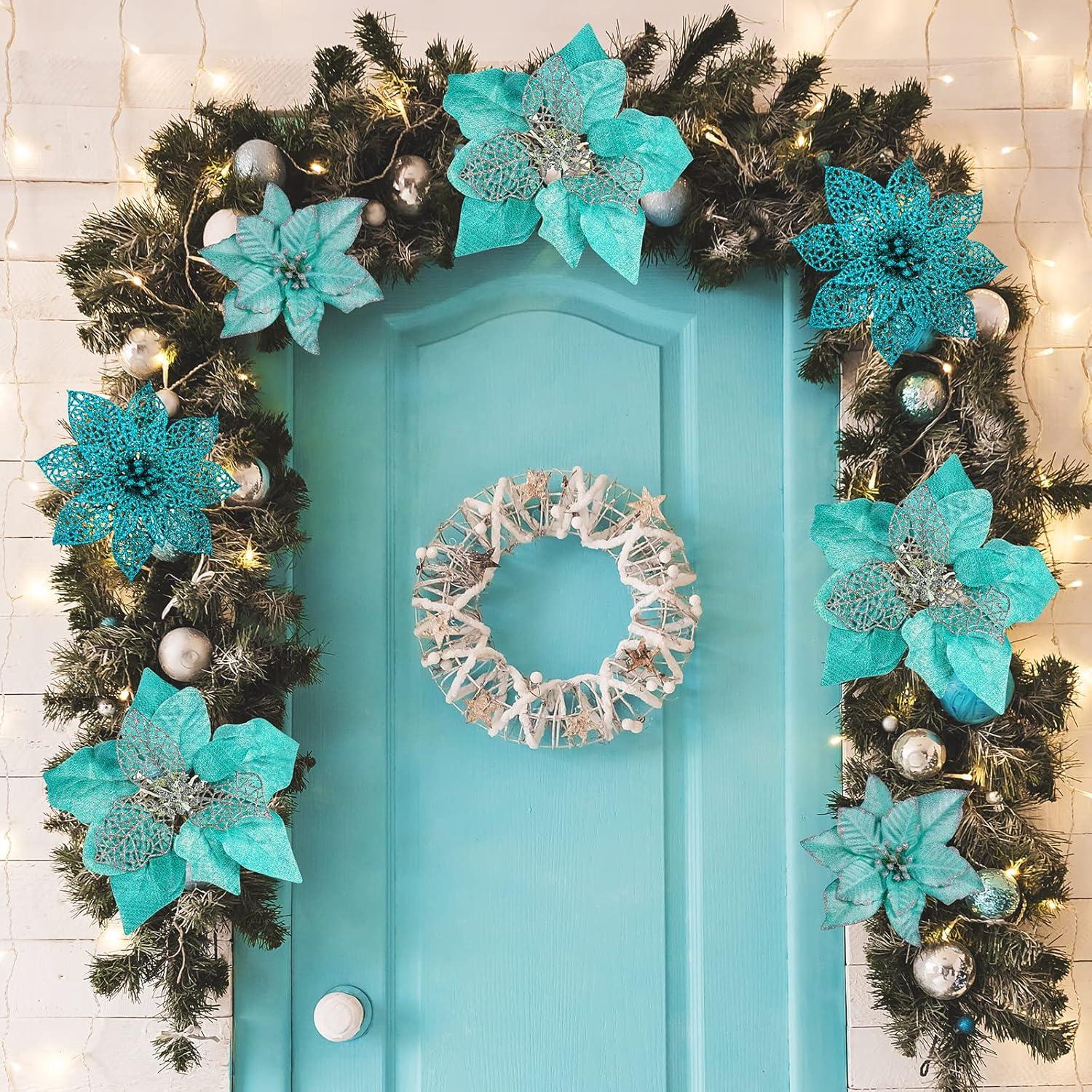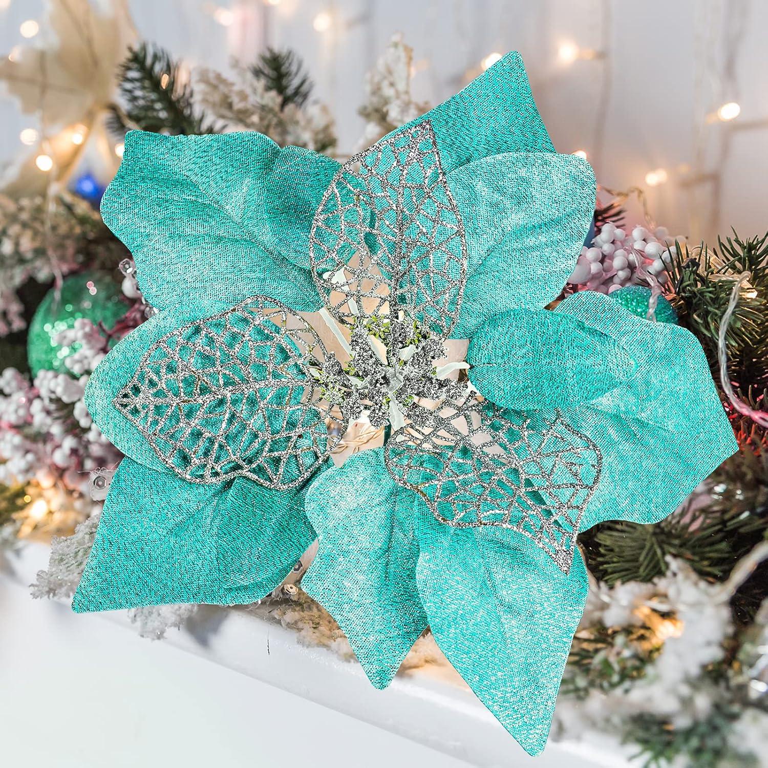 Material: The blue Christmas poinsettia flowers are made of fabric and plastic with shimmering glitter powder. The flexible paper-wrapped wired stems are easy to shape and arrange to your liking, making them an effortless way to be used for a variety of holiday decorating needs. Glitter artificial poinsettia flowers will remain glittery and beautiful throughout the holiday season and can be reused every year to create new and exciting displays.