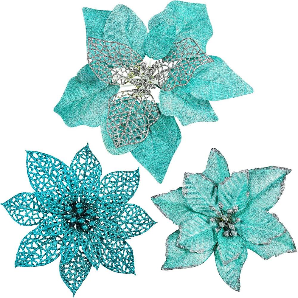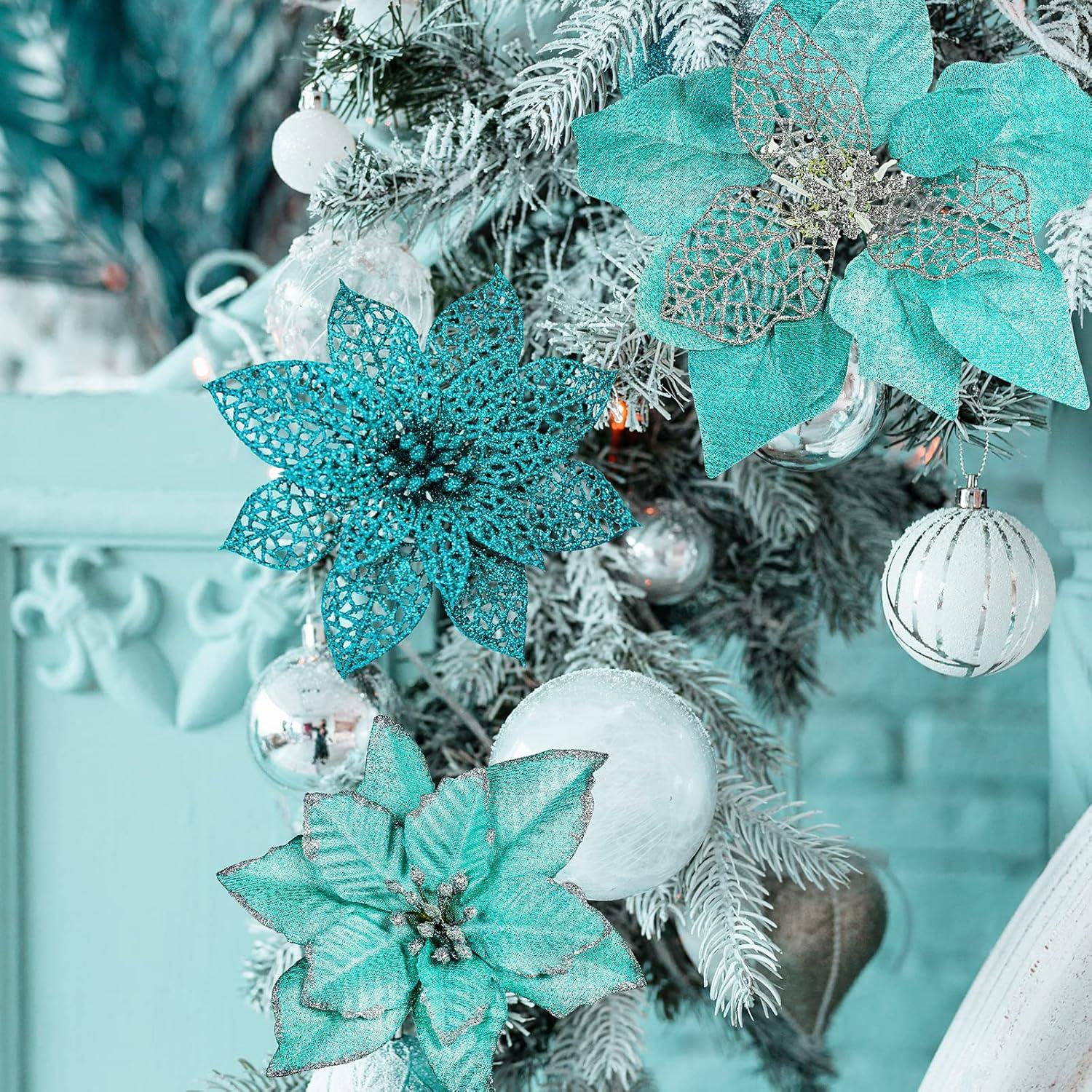 Winlyn 24 Set 3 Styles Christmas Blue Glitter Poinsettia Flowers Picks Christmas Tree Ornaments for Blue Christmas Tree Wreaths Garland Holiday Seasonal Wedding Decorations White Gift Box Included(Teal)