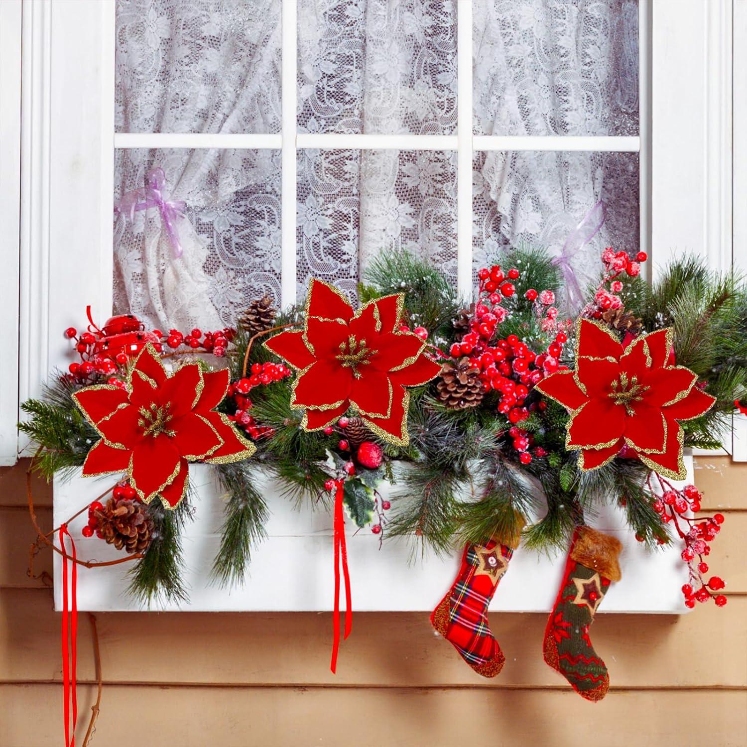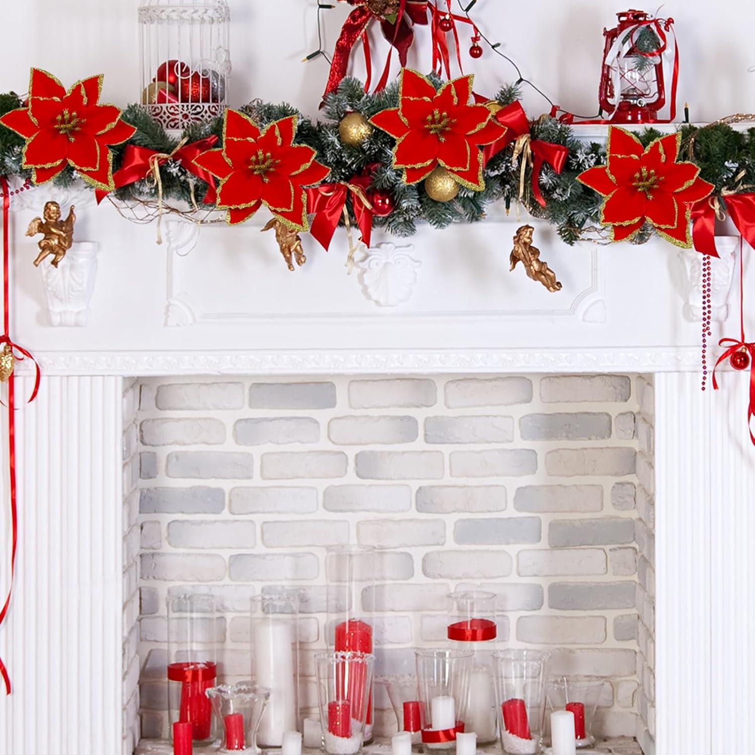 Material: Artificial Christmas flower picks are made of fabric and plastic with gold glitter powder, and the fabric petals are pressed to show realistic veining. The flexible paper-wrapped wired stems are easy to shape and arrange to your liking, making them an effortless way to be used for multiple holiday decorating needs. Faux gold poinsettia flowers will remain glittery and beautiful throughout the holiday season and can be reused each year to create new and exciting displays.