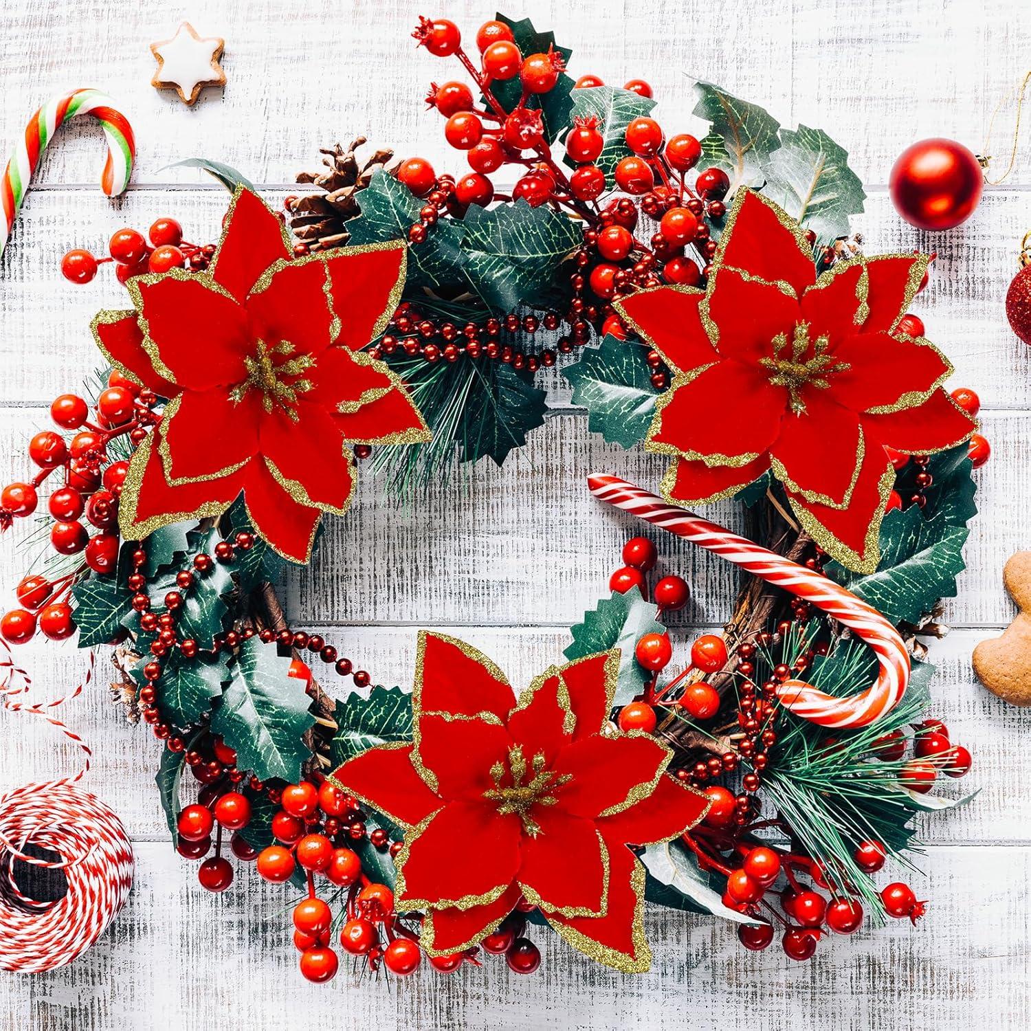 Winlyn 24 Set Christmas Glitter Gold Poinsettia Flowers Picks Christmas Tree Ornaments for Gold Christmas Tree Wreaths Garland Winter Holiday Seasonal Wedding Decorations White Gift Box Included(Red)