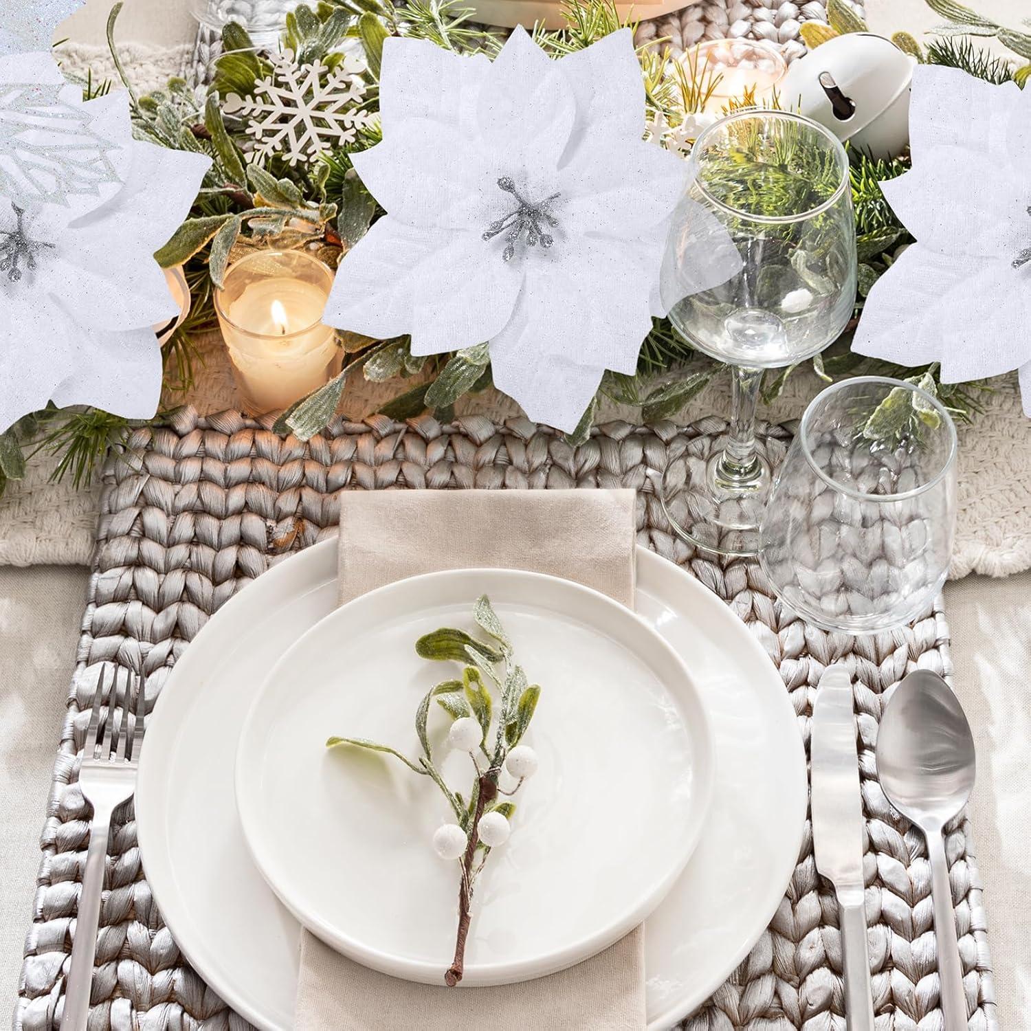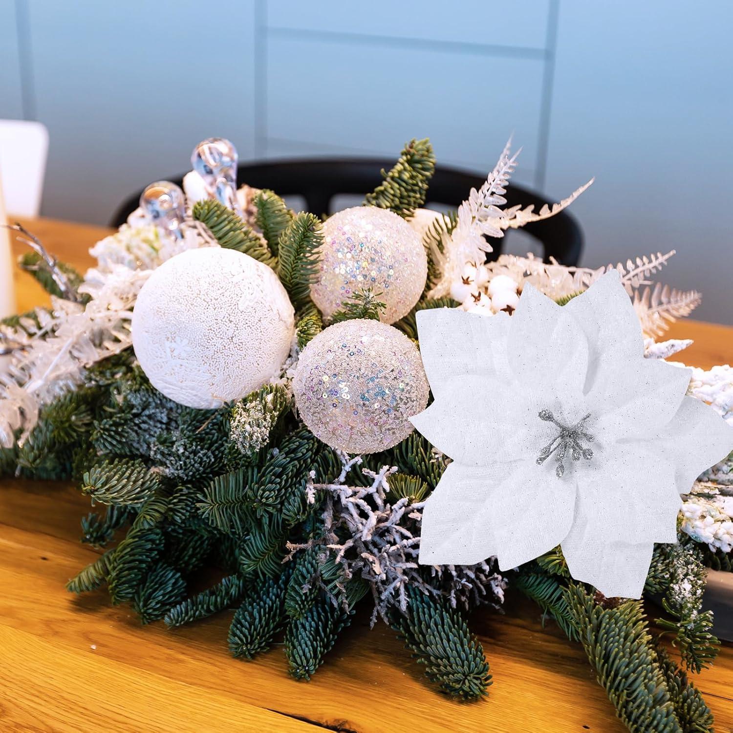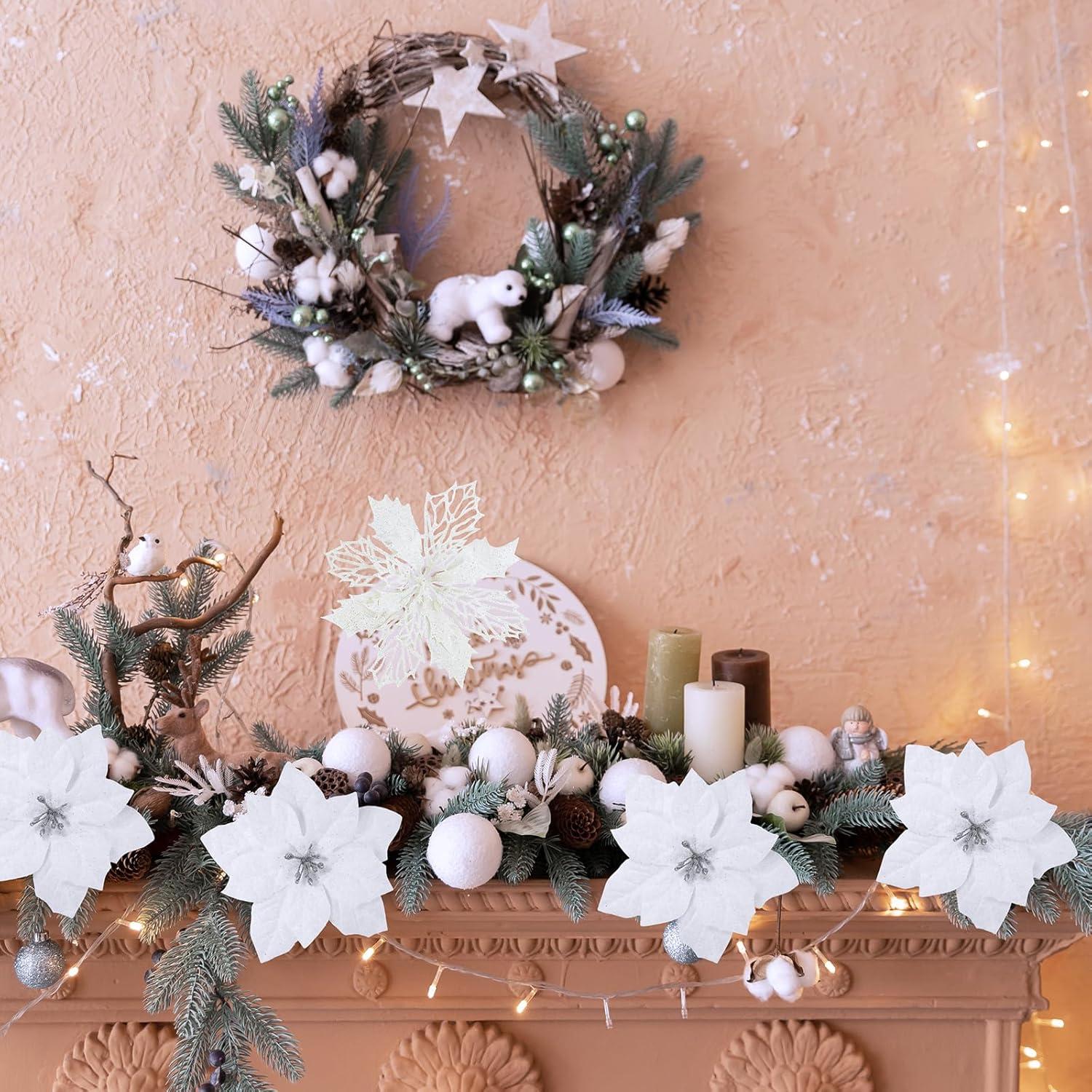 Winlyn 24 Set Christmas Glitter Gold Poinsettia Flowers Picks Christmas Tree Ornaments for Gold Christmas Tree Wreaths Garland Winter Holiday Seasonal Wedding Decorations White Gift Box Included(White)