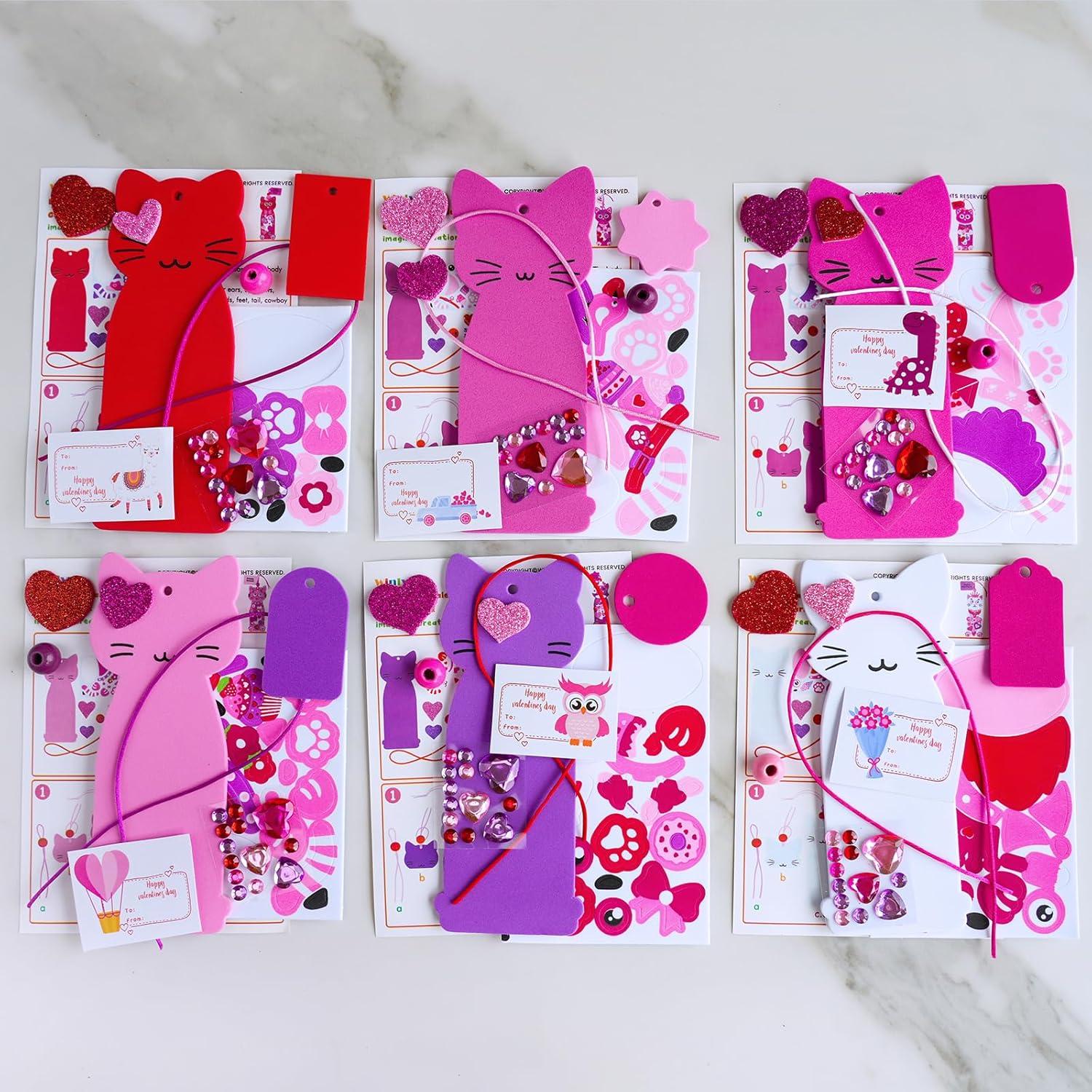 Quantity: This kids crafts pack includes 24 individually wrapped Valentine cat bookmark craft kits. Perfect for classrooms activities, party favors and group crafts. Each set features one of 6 kitten designs. Inside each kit: 1 foam cat bookmark base, 1 sheet of pre-cut self-adhesive foam stickers (ears, face, belly, hands, feet, tail, collar, and Valentine themed stickers), 2 glitter foam heart stickers, 1 gem sticker sheet, 1 hanging cord, 1 bead, 1 gift tag, and 1 guide. Plus, 24 gift stickers.