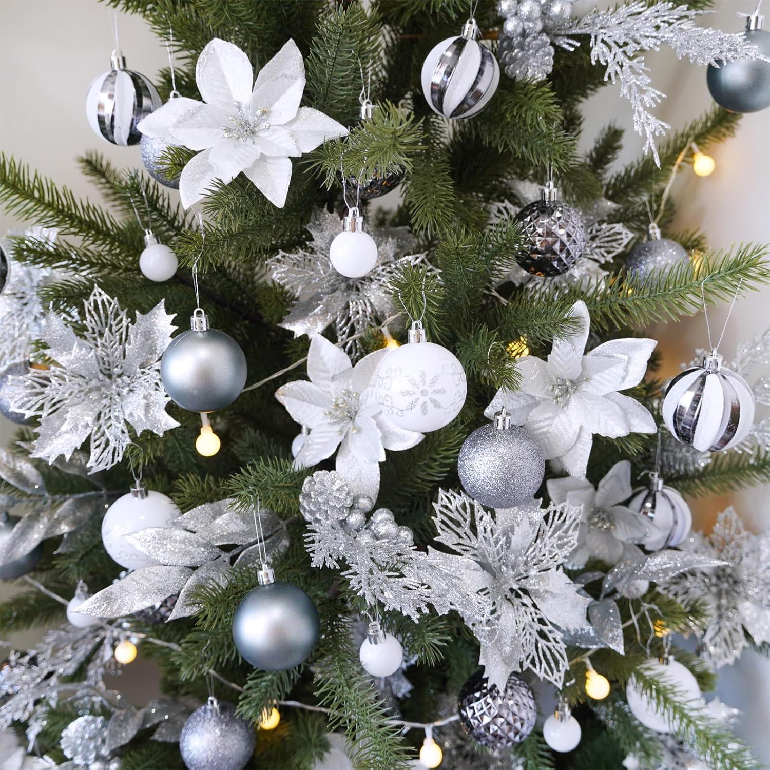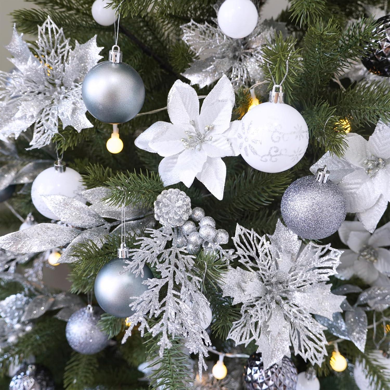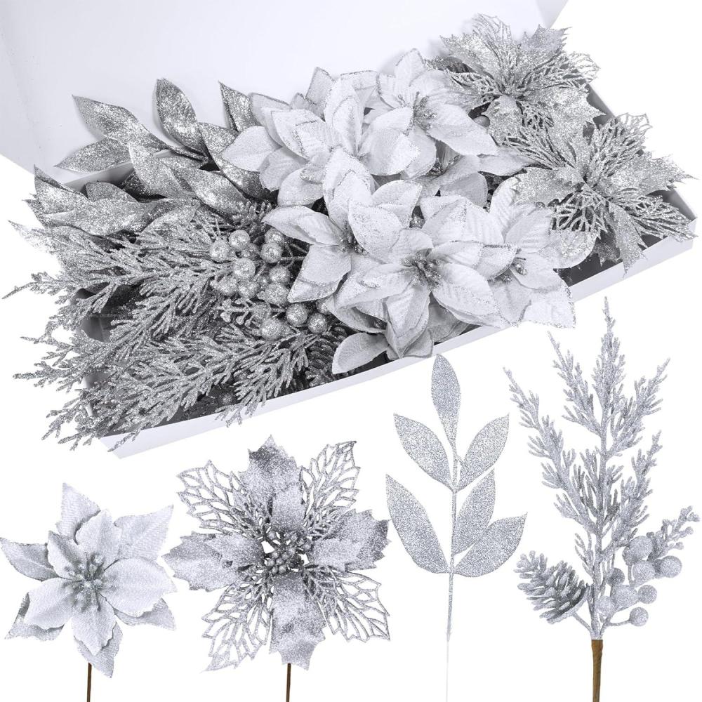 Winlyn 35 Pcs Christmas Artificial Poinsettia Flowers Picks and Artificial Leaves Sprays Teal Glitter Christmas Floral Picks for Teal Christmas Tree Holiday Decorations Centerpiece Wreath DIY Crafts(Silver)