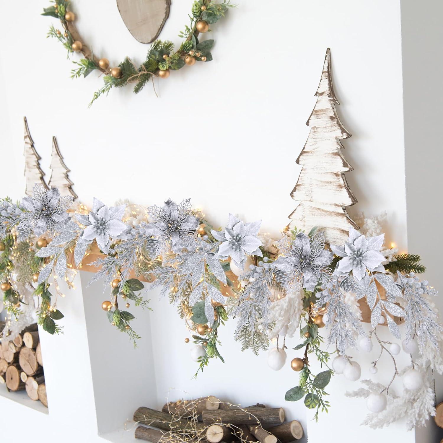 Design: These Christmas poinsettia flowers come in 2 styles. Layering petals surround the stunning collection of glittery round anthers and filaments, creating eye-catching teal blue glitter poinsettia flowers. The Christmas artificial leaf picks showcase shimmering bay leaves, pine sprigs, pine cones, and berries, adding a touch of natural beauty to your holiday display.