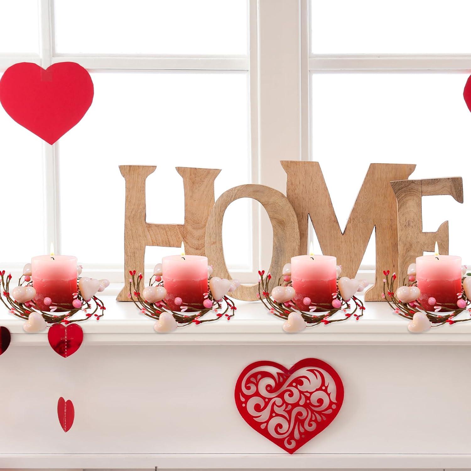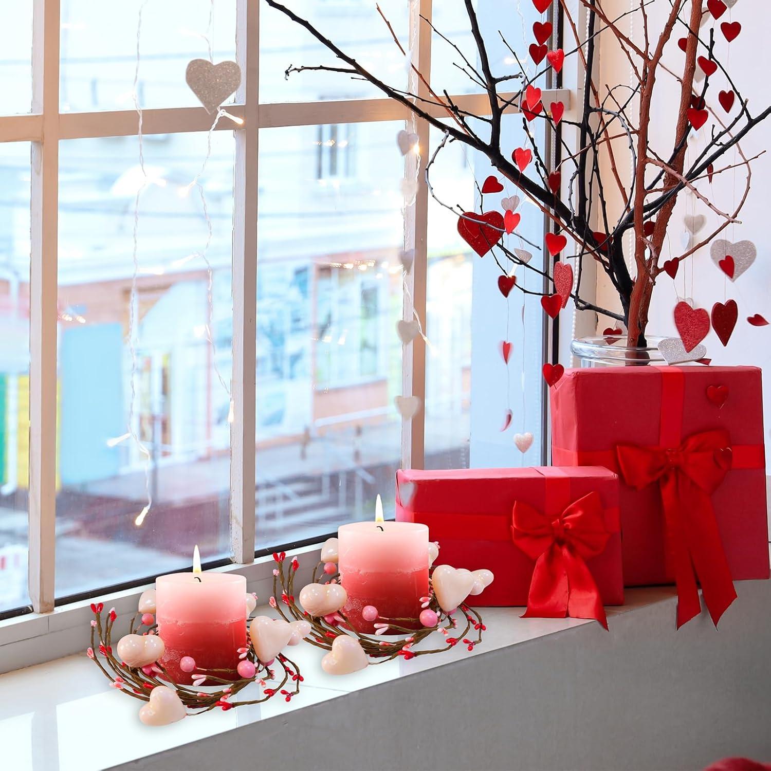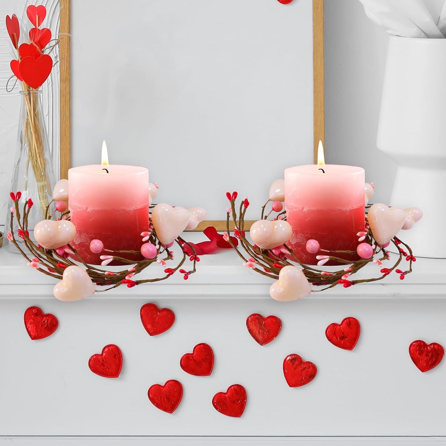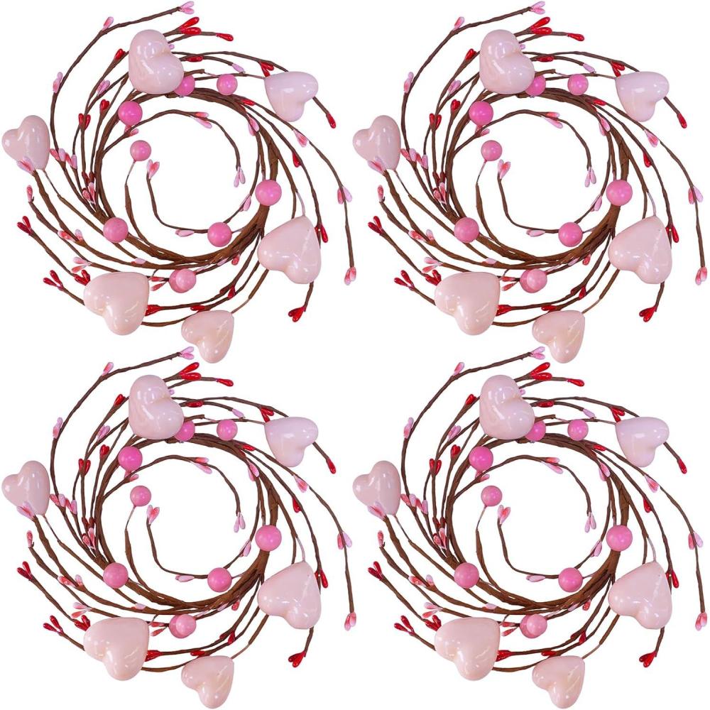 Winlyn 4 Pcs Valentine Candle Rings Wreaths Red Heart and Berry Candle Holder Rings Red Pip Berry Candle Rings Mini Wreaths 9.5″ Wide for Valentine’s Day Wedding Windows Table Centerpieces(Pink)